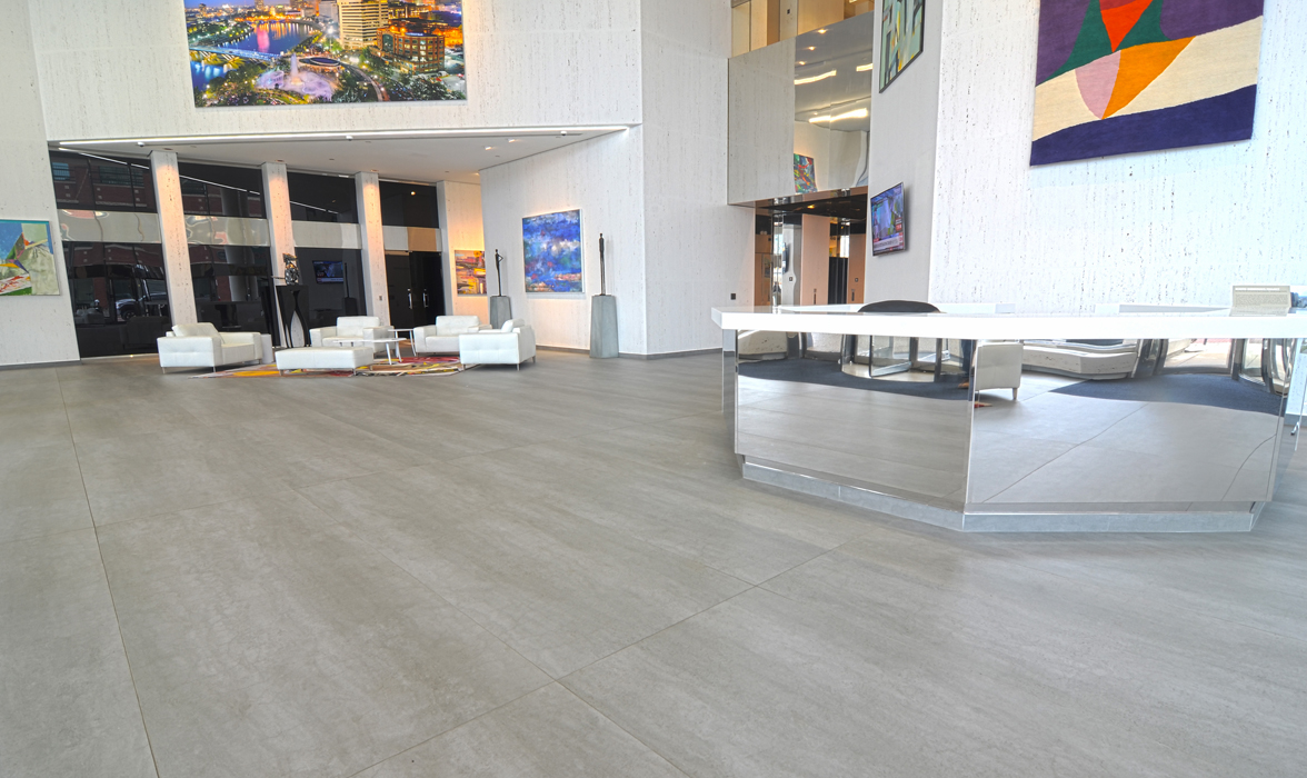 The decision makers for 200 Civic Center’s update turned to Columbus-based architectural firm Behal Sampson Dietz to lead the lobby project. The building’s original, 1983 lobby floor and walls were covered in travertine that didn’t appeal to modern design sensibilities. Knowing the lobby plays such a pivotal role in setting the stage for the entire building it represents, the specification team searched for an innovative surfacing material that would provide a sleek, sophisticated appearance, easy maintenance, and exceptional durability—all for the long-term.
