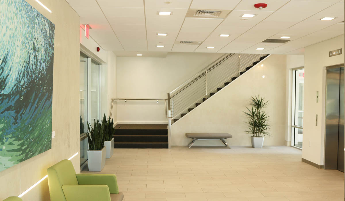 For the interior portion of the project, the architectural team decided the lobby needed to be completely gutted and redesigned. To tie the exterior and interior spaces together, they chose the same Crossville porcelain tile panels for the walls and incorporated LED strip lights from the exterior into the lobby. Additional lobby features include a new high-end, stainless-steel stair rail, and a dramatic three-story chandelier.
