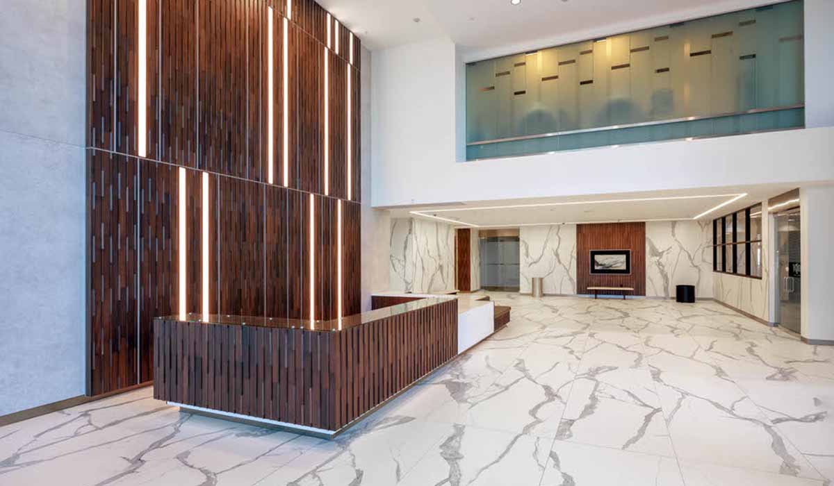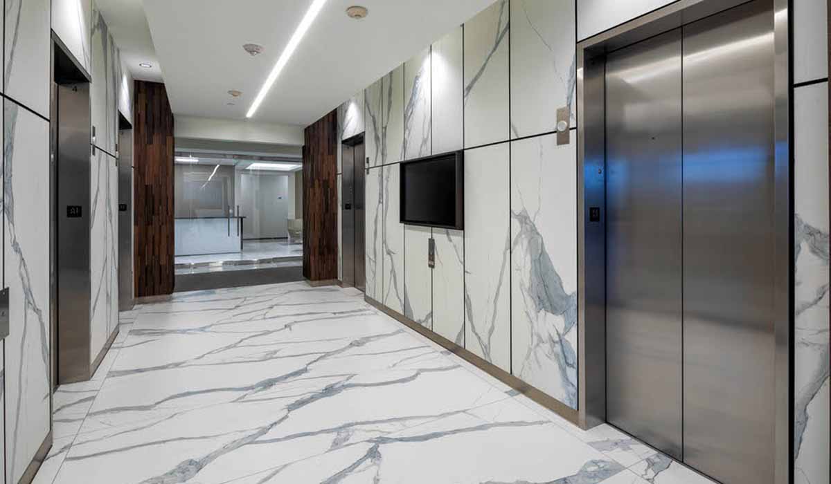 In a market with increased demand, it was essential that the building be modernized to heighten its appeal. The original flooring throughout the lobby was beautiful but dated natural granite. The design team was concerned about removing the stone because it would be noisy, messy, time-consuming and an additional sizeable expense. Through multiple consultations, the team chose Crossville Porcelain Tile Panels by Laminam. Because Crossville’s porcelain tile panels could be installed directly over the old granite, the installation would be quick and efficient, minimizing intrusion for building tenants while also achieving the dramatic transformation desired.