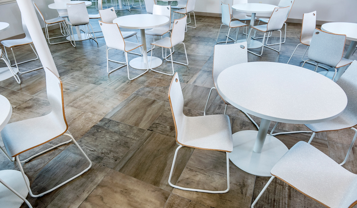Reclamation is again utilized in the store’s Good Day Café, where sleek, modern-style white chairs and tables offer juxtaposition to the warm tone of the porcelain tile. The space is an oasis within the store, offering shoppers a place to relax and enjoy a drink or meal from the store’s prepared food section.