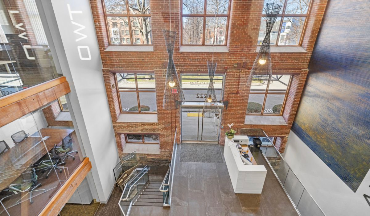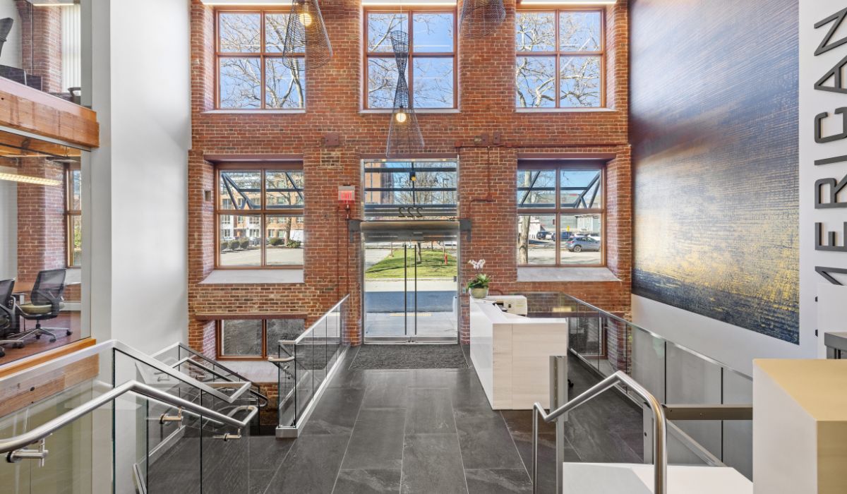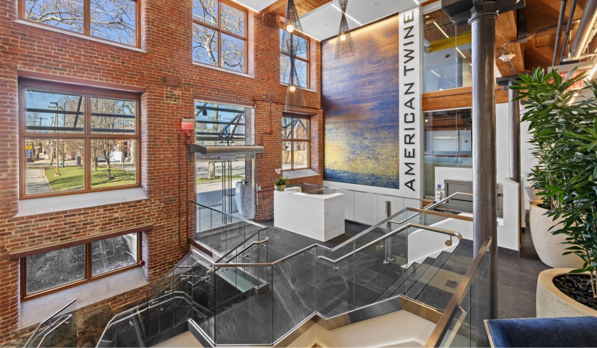 In recent years, the American Twine building has undergone significant renovations to transform it into a modern office space while preserving its historical essence. After a complete renovation in 1984, the 117,000-square-foot building could house corporate office suites of various sizes and layouts. These spaces feature exposed brick and beam structures, complemented by large windows that fill the interior with natural light.