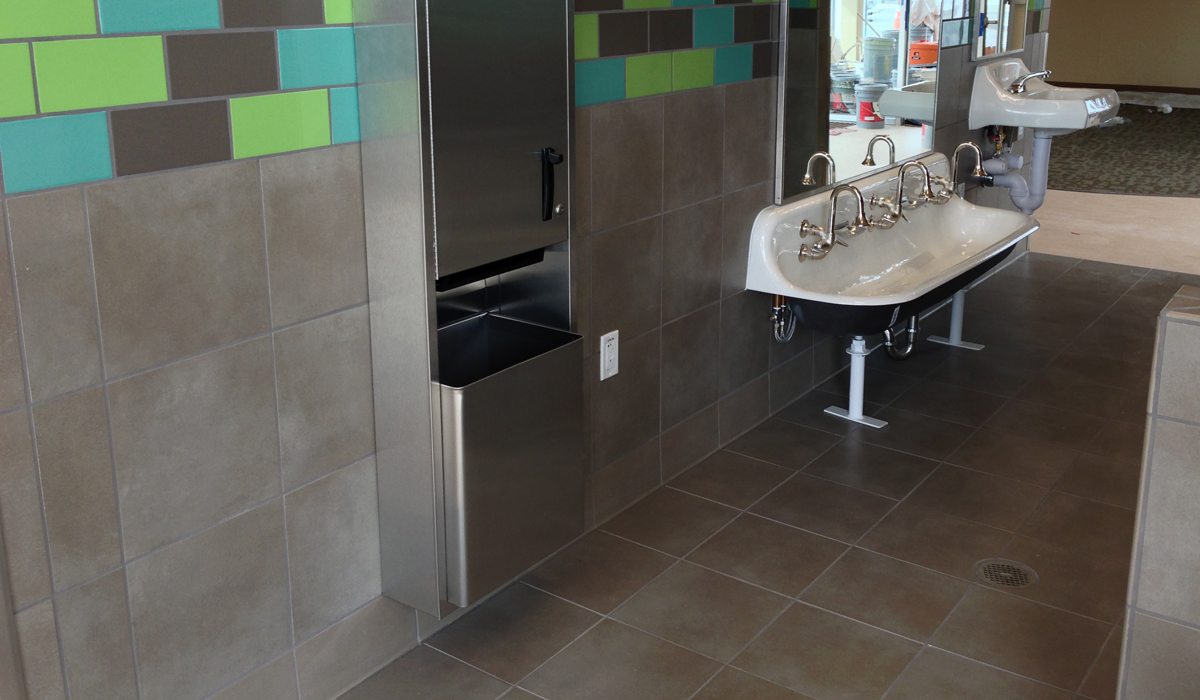 The interior restrooms were completed with Crossville’s Color Blox and Color By Numbers Collections. The color combinations feature the Cross-Sheen finish for easy maintenance and cleaning. Manufactured in the U.S., Color Blox contains a 4% pre-consumer recycled content and is Green Squared certified through the Tile Council of North America for its proven standards of sustainability.