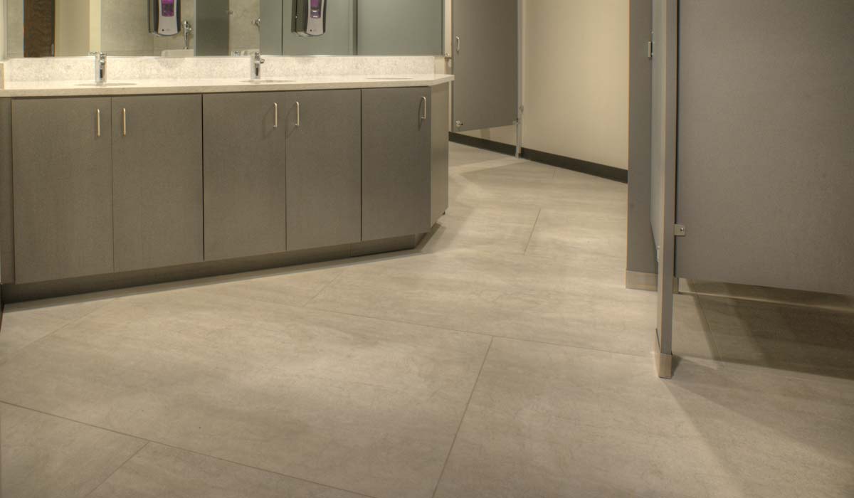 With six offices throughout its territory in Florida, the agency moved into corporate headquarters in Clearwater in 1988—in a building constructed in the mid-1970s. Over the years, the 30,000 square-foot, two-story facility came to be in dire need of a complete interior renovation to meet the current and future programmatic needs. The leadership of Bouchard selected Ai Collaborative as the architecture firm for the two-phase renovation. As part of the scope of work, the AiC design team was tasked with updating the men’s and women’s restrooms with a complete materials refresh. For the walls and floors in this busy headquarters, the team sought a material that would allow for efficient installation, ideally by eliminating the need for complete demolition of the existing tiled surfaces in the restrooms. Crossville Porcelain Tile Panels by Laminam proved to be the ideal specification. Offering a contemporary style, thin profile, and ability to be installed directly over a range of existing surfaces, Crossville’s porcelain tile panels offered the technical characteristics and style required for this demanding wall and flooring project—all without the liability of demolition disruptions to the building’s occupants.
