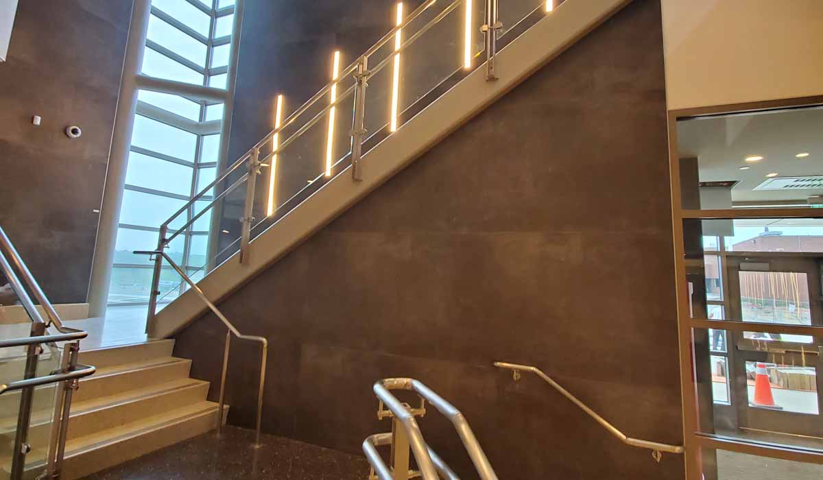 The walls of the open, two-story lobby and stairwells proved to be ideal areas to make bold design statements that convey CCT’s renowned reputation. Project specifiers selected Crossville Porcelain Tile Panels by Laminam as coverings for these expansive surfaces that connect the school’s café and learning commons.