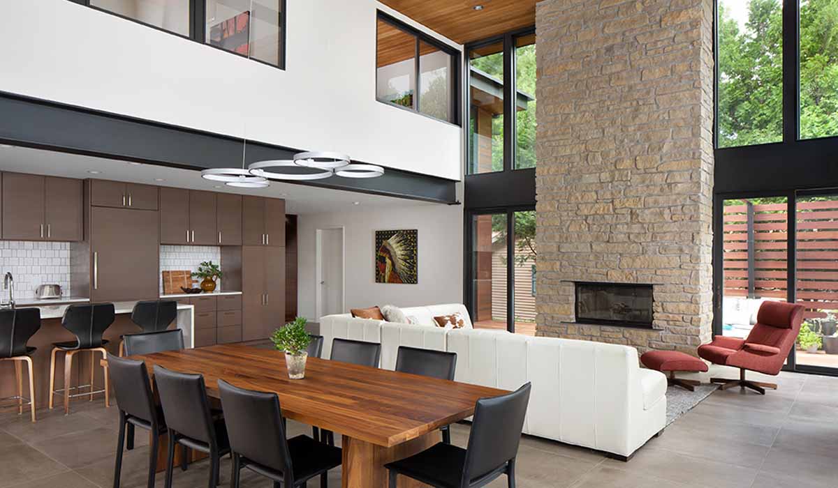 Zoning restrictions prohibited changes to the original footprint on the lake side of the home. Working with Bruns Architecture, the team complemented the original building outline with an interlocking component on the street side, where the setbacks are more relaxed. The design uses the power of line and material to define space, direct views, and create connections that provide a subtle rhythm to the living experience.