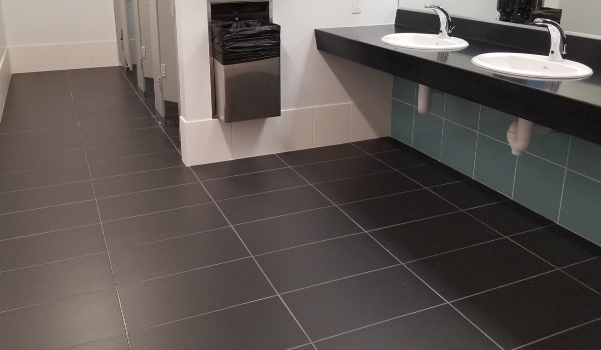 For the restrooms, the team chose Crossville’s Retro Active 2.0 in a color combination of Snow Blind, Armor, and Gulf Breeze. Like Physics, Retro Active 2.0 collection is a through-body tile, potentially minimizing color issues should any tiles sustain damage in the long-term. The crisp Snow Blind tile applied on the walls as baseboards blends beautifully with the flooring in the Armor colorway, creating the classic contrast of black and white. To add interest to the restroom design, the team accented the spaces with Gulf Breeze tile on some of the walls, adding the touch of blue tones that provide a subtle compliment the building’s exterior.