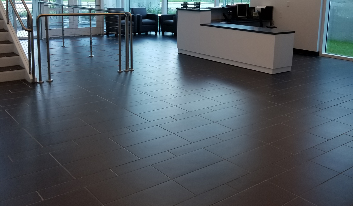 Crossville’s Physics* Collection provided the foundation style for the lobby flooring, boldly drawing attention to the accent waves and light fixtures in the ceiling and the modern feel of the stairway design. Physics porcelain tile offers a sophisticated interpretation of a classic visual with a dappling of rich pigmentation. Additionally, Crossville tile collections are through-body porcelain engineered for longstanding color.