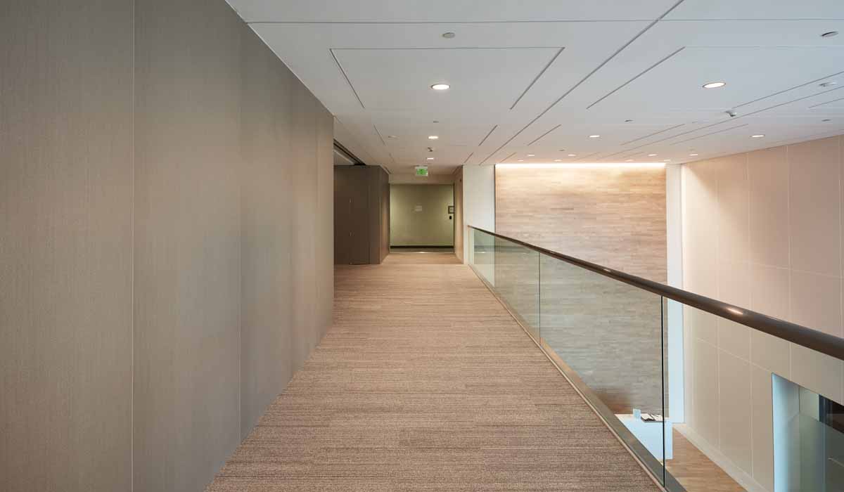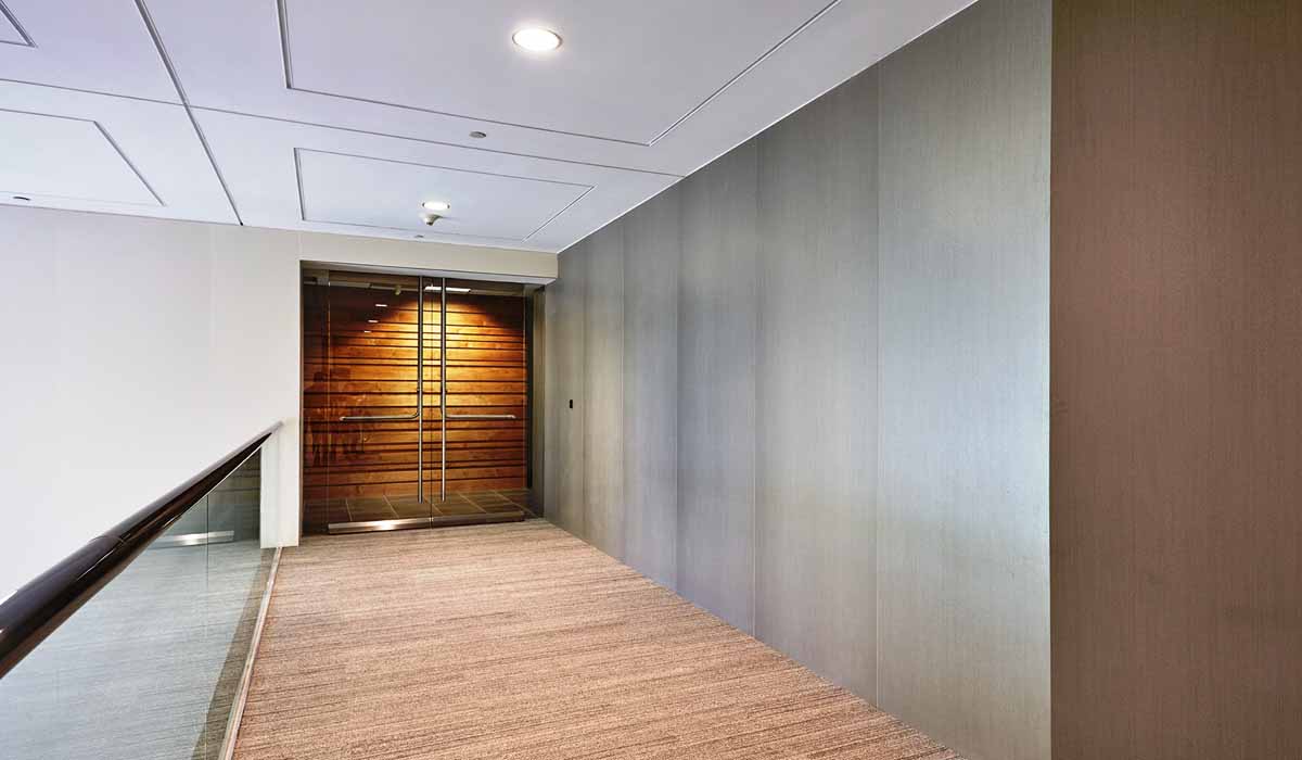 Pulling in a metallic style, the designers chose Crossville’s Laminam porcelain tile panels in Filo for the wall surfacing in the elevators. Providing a slight texture and shimmer, the tile enhanced the small elevator space without being overwhelming. With an extremely lean profile, Crossville 3+ gauged porcelain tile panels are just over 3mm in thickness, and thus proved to be the ideal solution for the elevators.