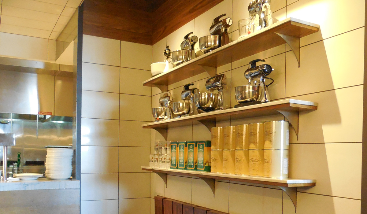 To draw attention to the restaurant’s open kitchen, Shades, in the color Frost, was specified with a contrasting dark grout. With its rectified format and rectangular shape, the installation feels fashionably current and, paired with the shiny stainless steel used throughout the kitchen, pulls all eyes towards the staff at work—reinforcing the idea that food is the focus for Daily Grill. Shades was even installed on a suspended ceiling over the kitchen, a unique application that, according to designer Jen Smith “… was a way to create an intimate dining experience that was different than the other dining areas. We wanted the kitchen to feel like it was enveloping the dining room and that when sat in that particular area that you were indeed part of the kitchen energy.” And, of course, the tile is as functional as it is beautiful, offering ease of clean up in the event of spills and splatters.