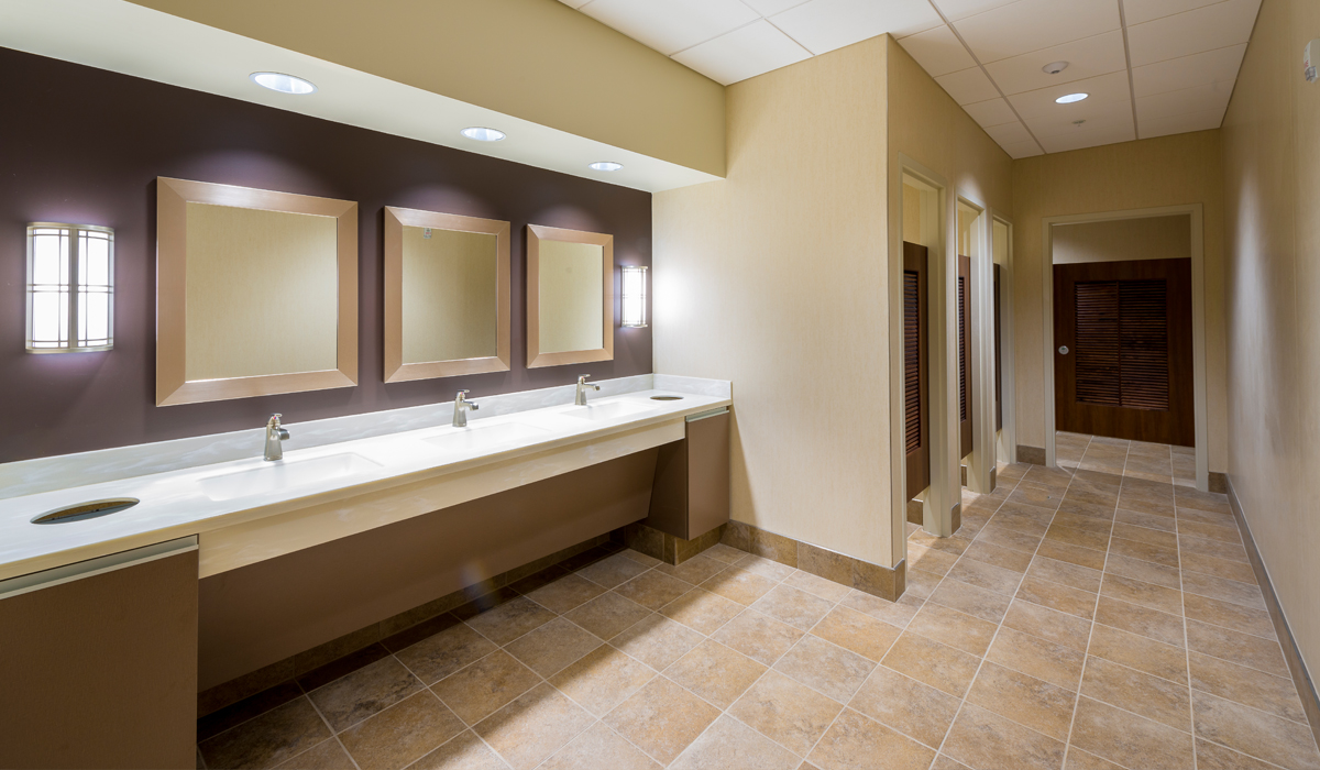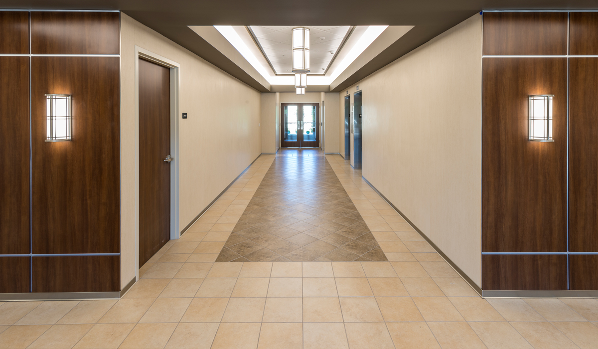 For the floors in the lobby and restrooms, the team specified a complementary Crossville collection with the right look and performance characteristics. Throughout the lobby, the team chose to install a darker neutral tone tile in the middle of the floor and edged the hallway with lighter tones, providing pathway directional support., Crossville’s porcelain tile is easy to maintain with simple and regular cleaning.