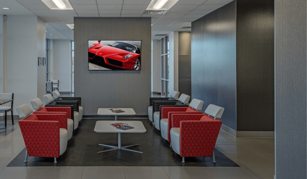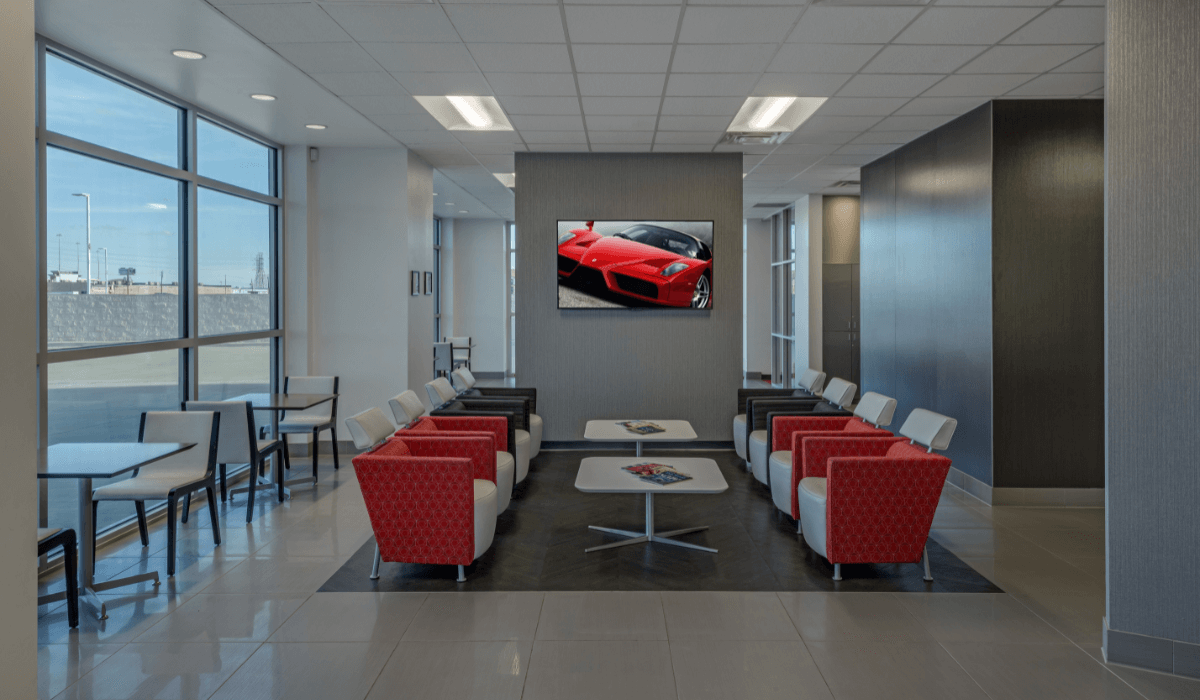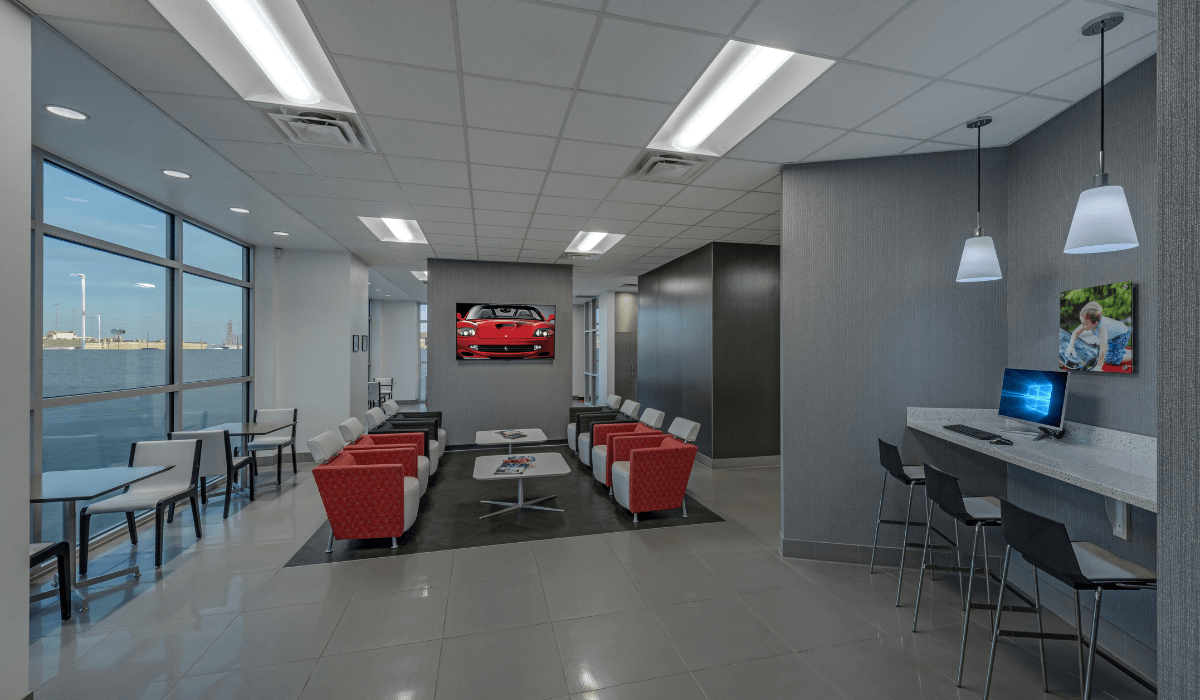 In addition to the showroom, the owner wanted a special focus on the customer lounge area for people getting their cars serviced. Bennett Design Group (BDG) chose Crossville’s Shades 2.0 in the Ash and Mist hues in the 24” x 24” size. The tile selections beautifully provide a modern setting with the high performance needed in such a high-traffic area.