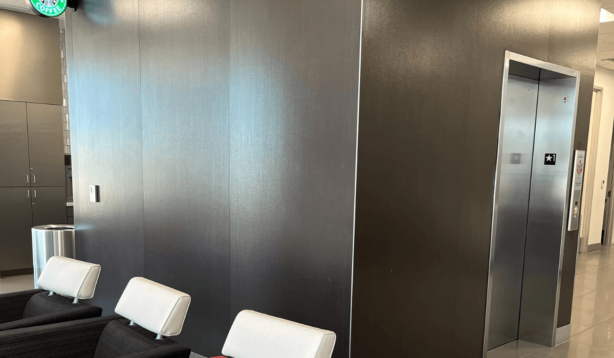 To skin the wall surfaces of the elevator core, BDG chose Crossville’s Porcelain Tile Panels by Laminam providing a sleek modern aesthetic in the space next to the customer lounge. Installed on the walls, Laminam’s Filo collection in the Argento color adds a textured, metallic finish creating a uniform yet dimensional surfacing solution. With their generous 1M x 3M exterior dimensions and lean 3 mm thickness, the Laminam panels offer the size and style the space demands.