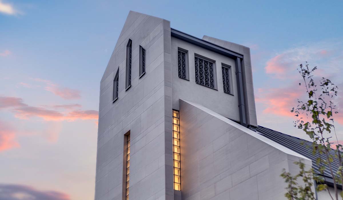 A modern approach while rooted in ritual and traditional values influenced the aesthetical elements and overall form of the church. The new church is a monolithic structure appearing to rise from the ground as if carved out of stone. To help create a church that references the past while embracing a current, contemporary design, the team selected Crossville’s Shades porcelain stone collection for the exterior cladding of the new facility. The 12” x 24” tiles are installed in a horizontal pattern giving the illusion of an elongated space on the property. The rich, earthy blend of Shades tones adds the perfect warm touch and pulled in natural elements promoting a cohesive flow from the worship space to the administration area.