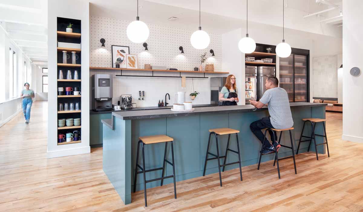 For the ever-important staff break room, the design team chose to specify Crossville Porcelain Slabs in the stunning Black Tie color in the unpolished finish for the countertops. The digitally produced surface design of these 100% porcelain slabs provide an appearance that beautifully mimics natural stone. Crossville Porcelains Slabs are a great alternative to other commonly used surfaces. These 12 mm-thick slabs provide all the performance advantages expected of commercial-grade porcelain tile, including easy maintenance and no worries of staining. From the coffee and sink space to the beautiful high-top bar, the result is a bold, strong, yet modern appearance of the two countertop areas that mix beautifully with the break area’s complimentary warm wood and bright white tones.