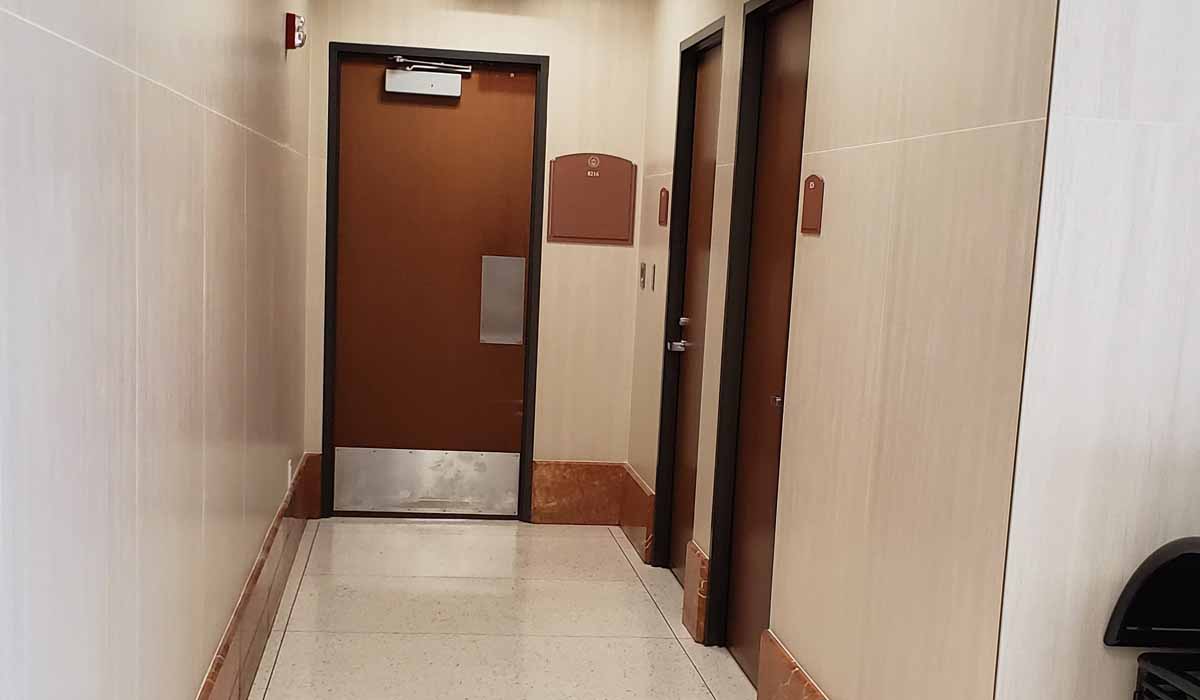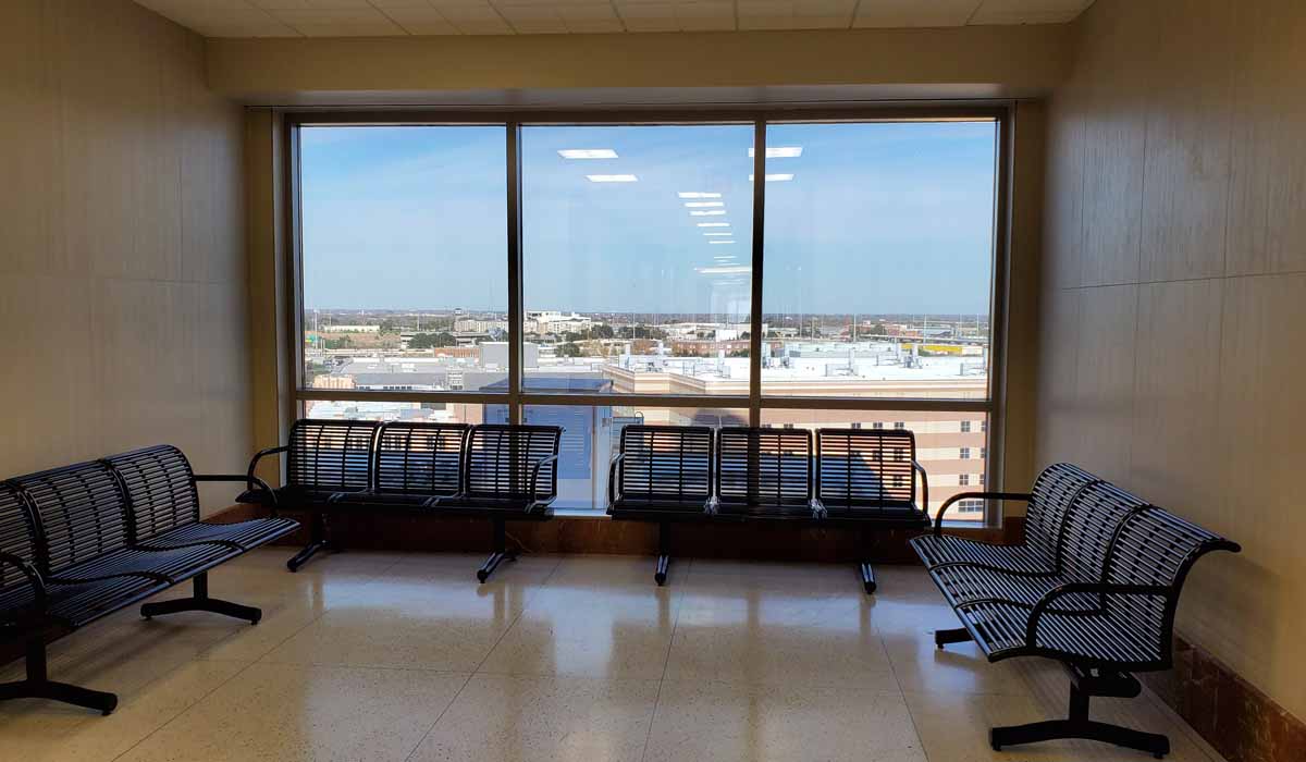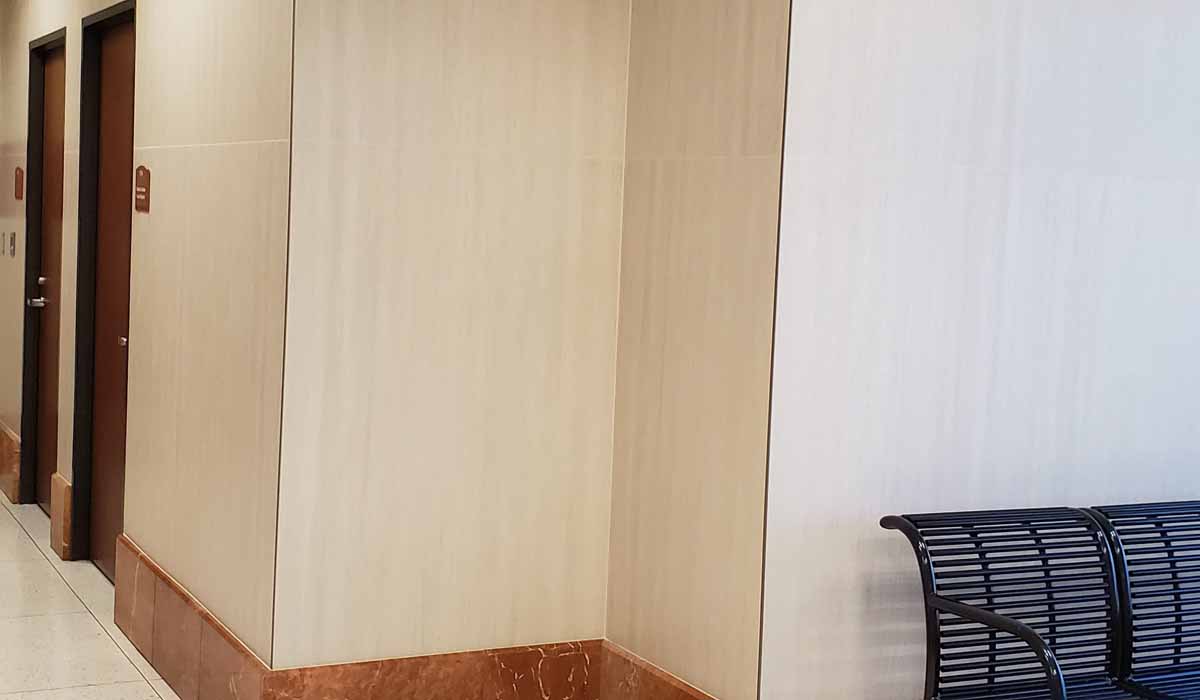 With a short lead time, the design team at PGAL was searching for wall-covering products that mimicked travertine but offered high performance and easy maintenance. The team wanted a product that would withstand another water incident and needed a product that offered a soothing style for the many people that visit the building during stressful periods.