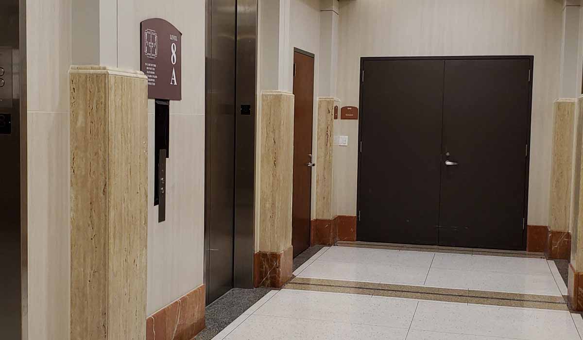 The team specified Crossville Porcelain Tile Panels by Laminam in I Naturali collection in two colorways for the building’s corridors and elevator walls. With the Ossidiana Vena Chiara colorway, the designers could create a high-impact interior design scheme on the walls in the high-traffic, well-traveled corridors. This selection offers an appearance that adds a classically rich depth to the space. Blending beautifully with the hallways, the team chose the Fokos Terra colorway for the elevator walls offering an earthy yet elegant style. The porcelain tile panels—with outer dimensions measured in feet yet a profile of only 3 mm in thickness—were quickly and easily installed with minimal grout lines providing a seamless style.