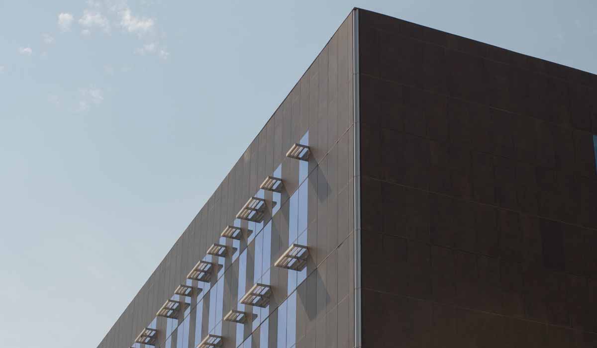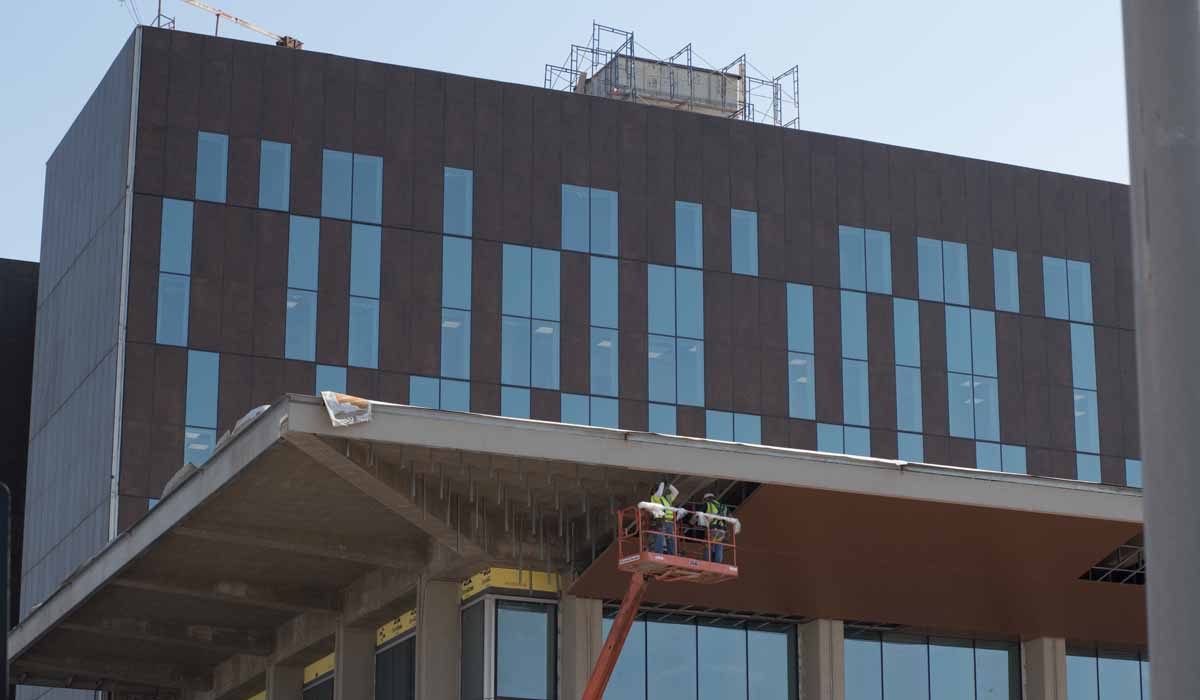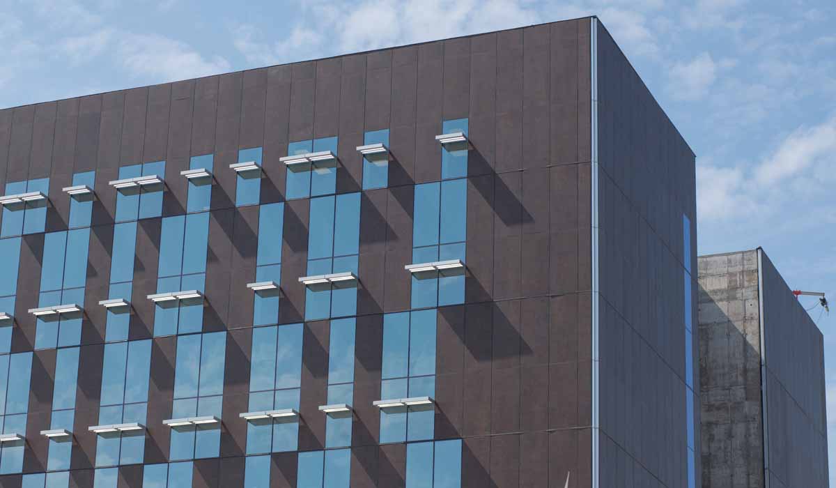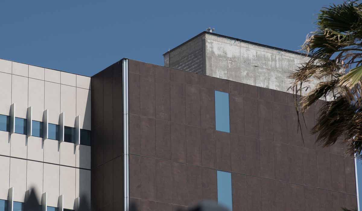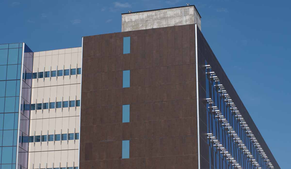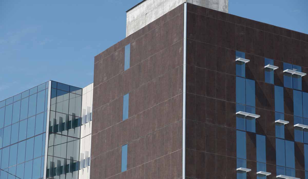 The designers chose Crossville porcelain tile panels in the Oxide collection offering a subtle, metallic shimmer that blends beautifully with the water-jet cut metal scrim contributing to the modern and stylish look of the building’s exterior.