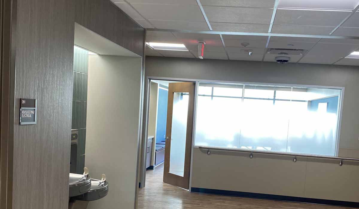 Moving the Central Supply, Pharmacy, and Respiratory Therapy departments to the second floor posed unique challenges. The medication carousel in the pharmacy department weighed 12,000 pounds, which required additional structural reinforcement. The second-floor windows were replaced with double-pane, high-performance windows to improve energy efficiency, and new window shades were added to reduce glare. UV-blocking film was applied to the exterior of the Clean Suite windows to comply with technical restrictions.