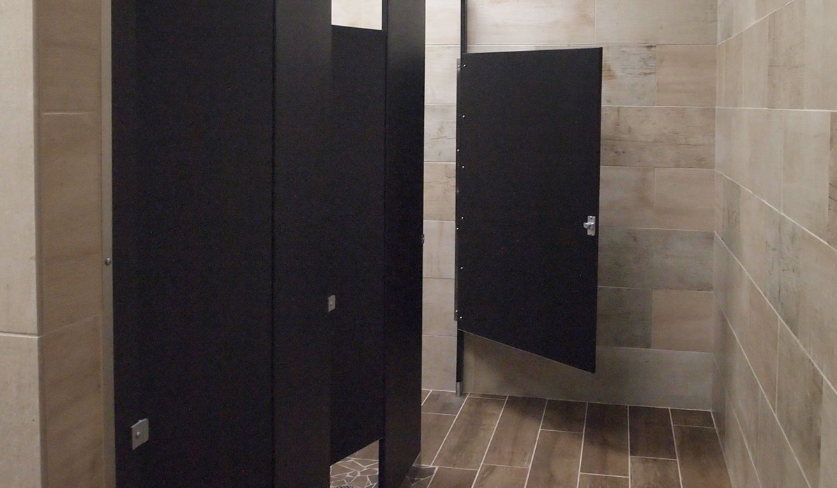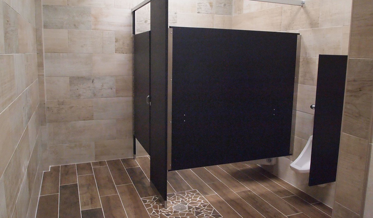 With a wood look that hearkens to the style of western culture, Crossville’s SpeakEasy in Sweet Georgia Brown proved to be an ideal choice for the bathroom floors. The SpeakEasy collection offers the convincing appearance of reclaimed barn wood interpreted in the durable, water-resistant strength of porcelain tile. The selection looks and performs well even in the busiest bathrooms and requires only minimal maintenance to keep looking great long term. In complement to the floors, the team chose Crossville’s Reclamation in Tobacco Road for bathroom walls. Echoing the spirit of repurposed materials, Reclamation blends a mix of wood and concrete looks to capture a modern edge with a hint of nostalgia—an excellent choice for the facility.