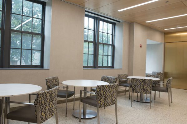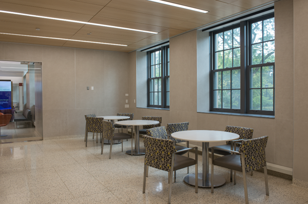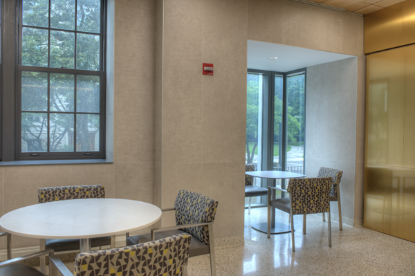 With flexibility as the key design element, the team chose Crossville Porcelain Tile Panels by Laminam for the wall surfaces in the classrooms and corridors of Kresge. “The tile panels provided us a thin, simple, and visually lightweight approach to wall surfaces in public areas that is durable and easy to clean in the most high-traffic areas of the building,” Lothan shares.