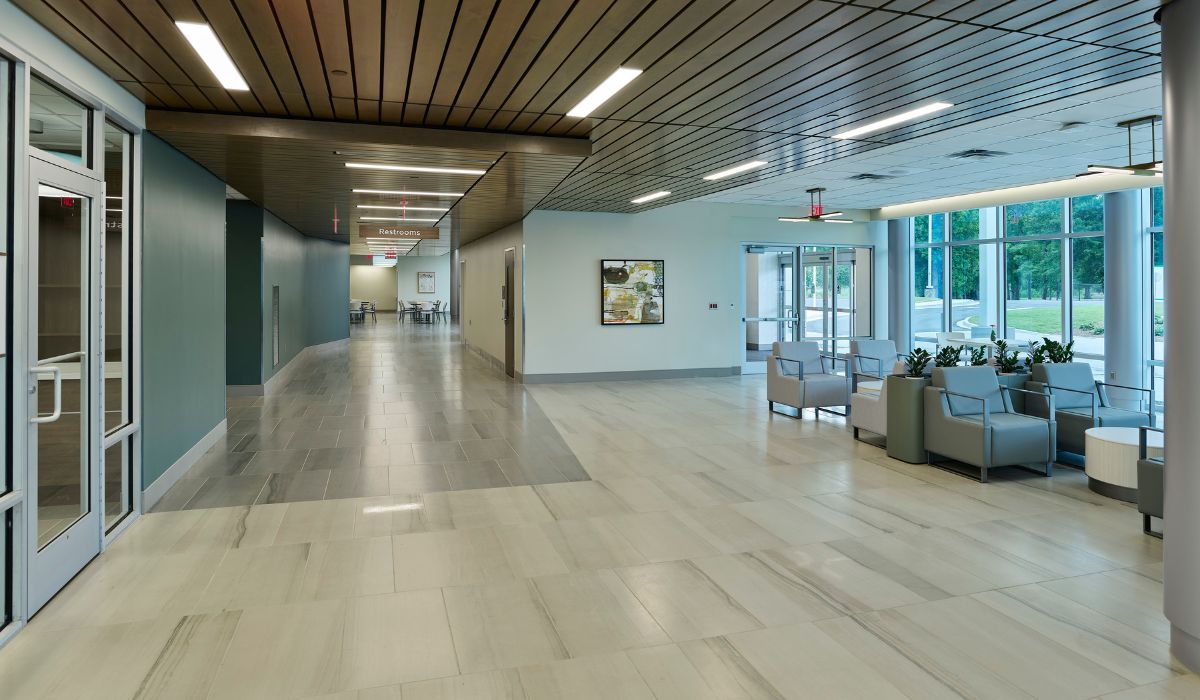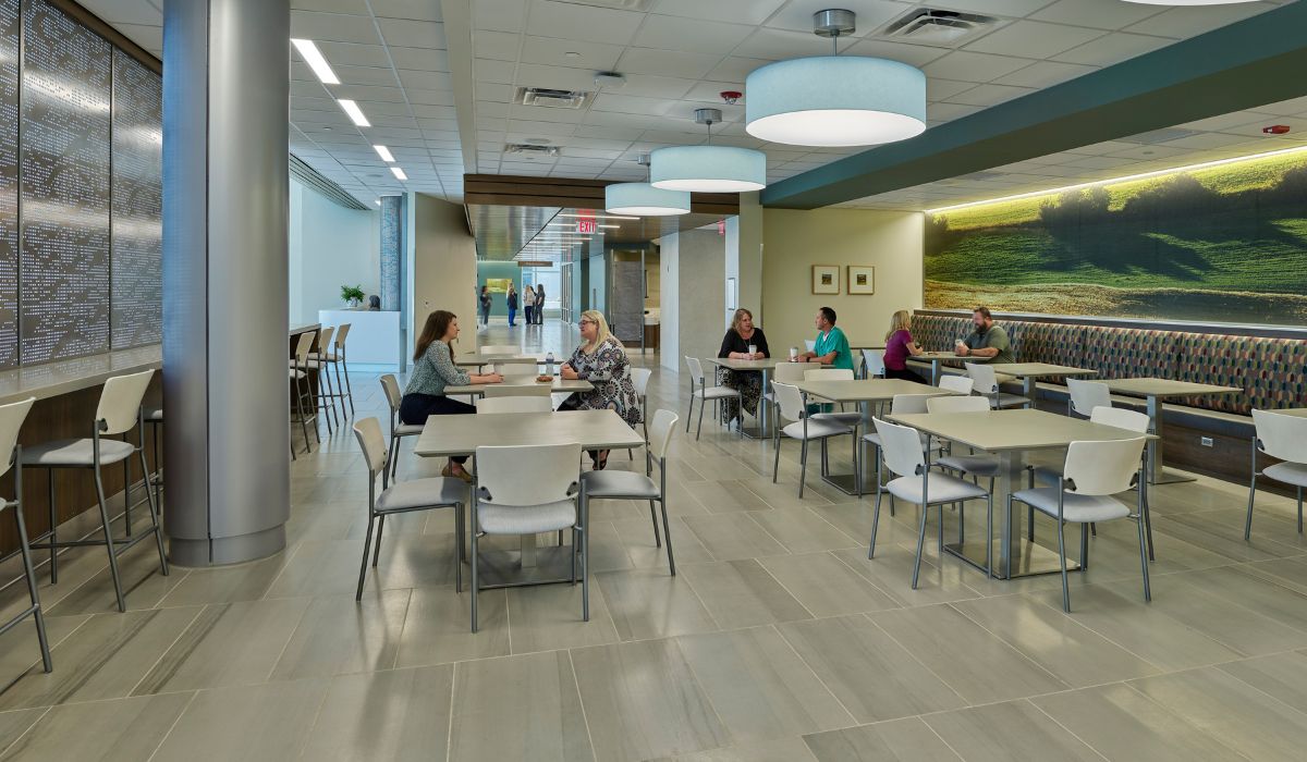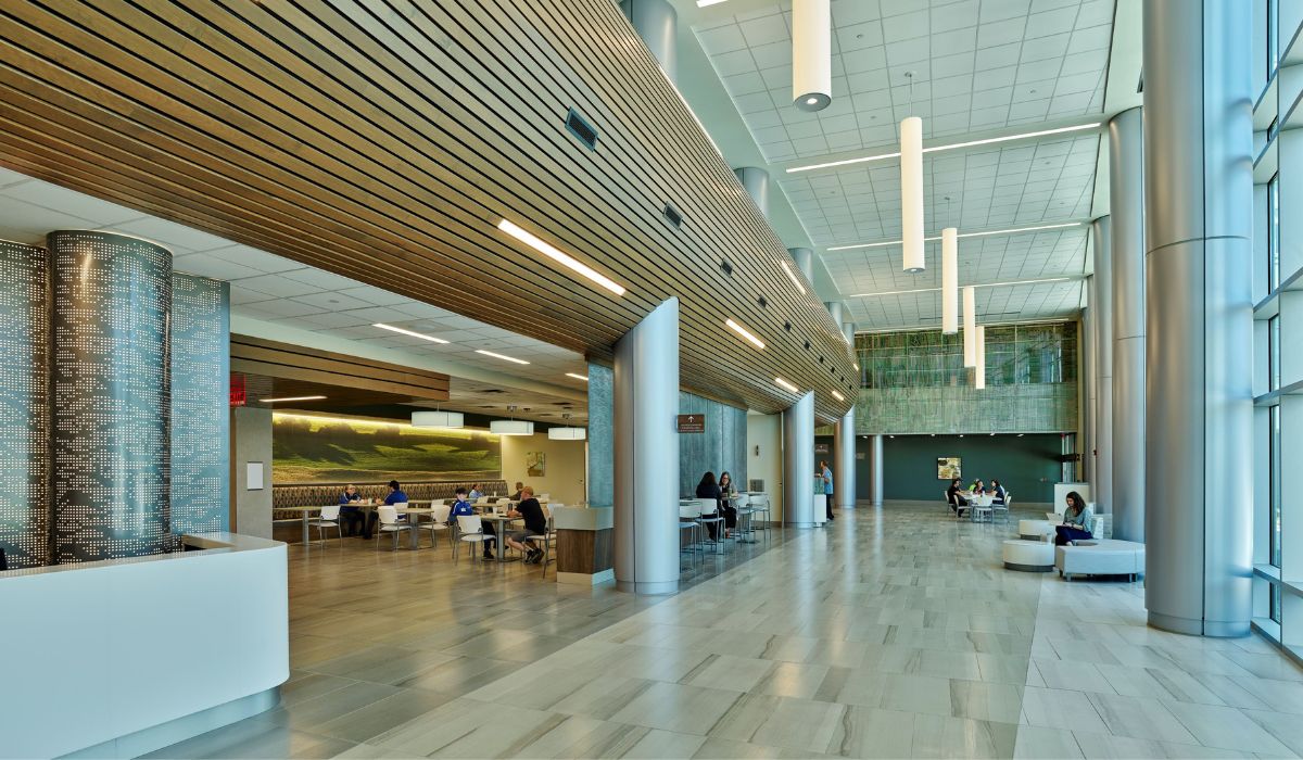 The new 25,000-square-foot concourse, which features expansive windows providing abundant natural light, houses a new cafeteria, coffee shop, gift shop, and waiting areas. The food service area features state-of-the-art kitchen equipment, a buffet-style serving area, and a large dining area.