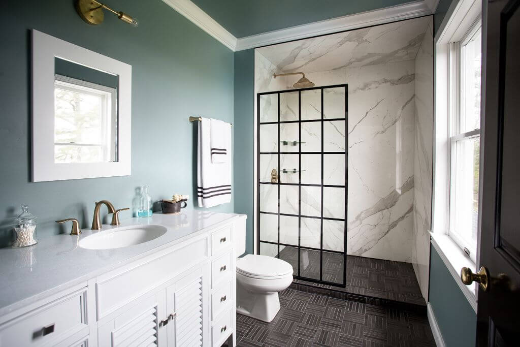 The guest bathroom also features a mix of classicism and modern sensibility, with tile at the foundation of the overall look. To achieve the modern touch, Workman chose Crossville’s Nest collection in Meditative Mosaic. This selection offers the clean and sophisticated look of wood flooring in a porcelain tile that provides the performance characteristics needed in for the wet environment of a bathroom. Workman coordinated the wood look of Nest on the floor with the classic appeal of the marble-inspired I Naturali gauged porcelain tile panels for the shower walls. The I Naturali in Statuario Venato creates a Roman Bath feel for the oversized shower area.