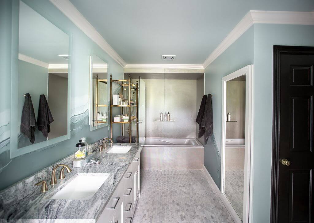 In the primary bath, Workman incorporated Crossville Porcelain Tile Panels by Laminam in the Filo collection. Filo tile panels capture a look reminiscent of sheet metal yet offer all the performance benefits of porcelain tile—a must for any bathroom design. The slight shimmer of the tile panels offers a perfectly understated glamorous effect for the farmhouse, and because the tile panels are installed with minimal grout line, they create an uninterrupted, panoramic backdrop for the soaking tub area. Workman coordinated the Filo tub surround on walls with Crossville’s Yin + Yang collection on the floor. She opted for the Snowflower color in an elongated hex marble mosaic to ground the space in classicism. The other bathroom walls were hand-painted with different shades of green to create a geode effect.