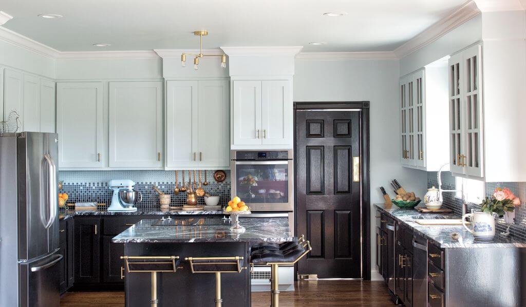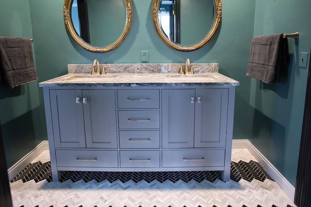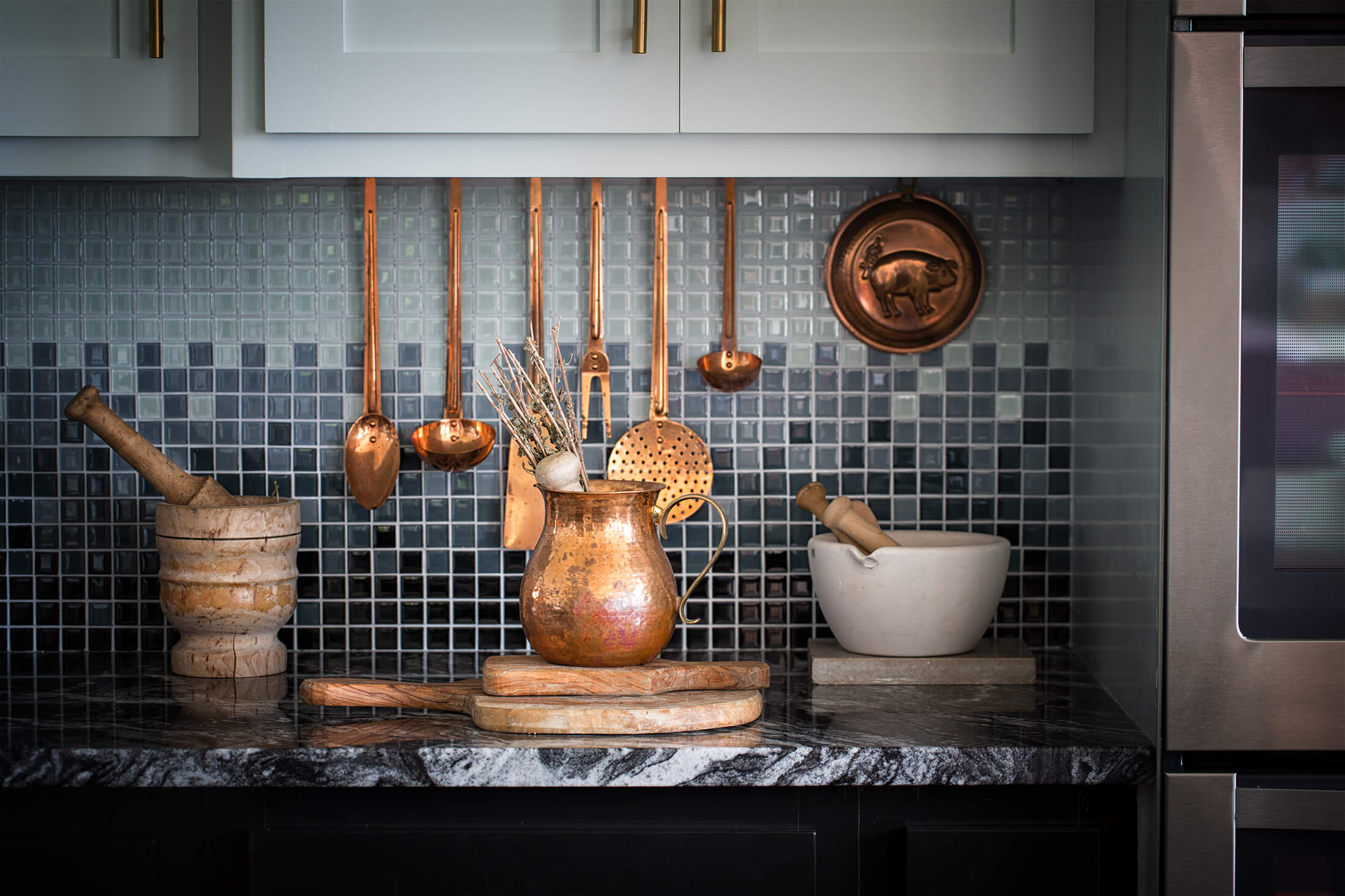 In the kitchen, Workman chose four shade variations of Crossville’s Glass Blox tile to create a nuanced backsplash. The mix of colors in the tile serves to create a transition from the darker tone of the lower cabinets and countertops to the lighter color of the upper cabinets. The inventive use of color on cabinets and in the multi-hued tile dresses the kitchen in custom creativity.