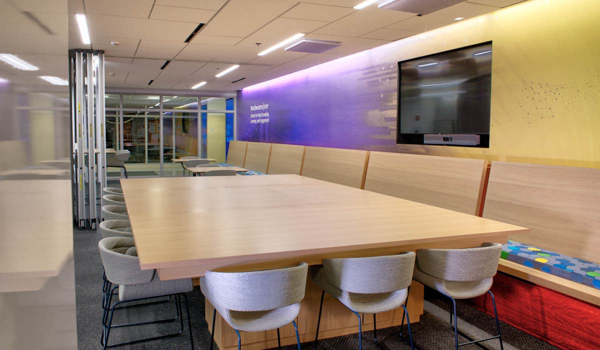 In recent days, it came time for another design transition, as Annenberg Hall’s entry and circulation space in the lobby were in need of an update to a more contemporary style. Decision makers with the university selected Booth Hansen Architects, the firm that originally designed the facility, to update these all-important entry areas. Inhabit Interiors was retained for interior design. Northwestern now requires that all new buildings on campus be LEED-certified, and although this was not a new build, sustainability was a top priority for the renovation.