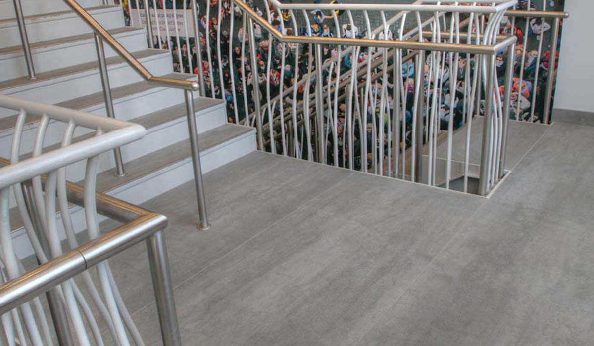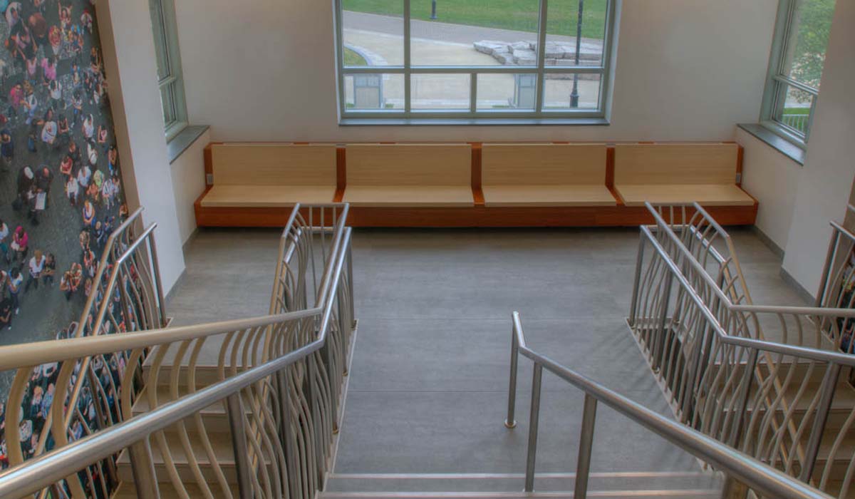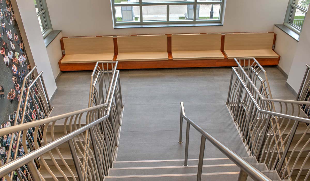 To complement the look on the walls, the design team opted for Pietra di Savoia – Grigia tile panels from Crossville’s I Naturali collection for the floor of the monument stair and landings. In combination with the fresh simplicity of the Avorio wall color, the Pietra di Savoia creates a soothing appearance that works harmoniously with other materials throughout the space. Long-term, these durable tile panels on both floor and wall will be easily cleaned and maintained while retaining their elegant appearance—a key benefit for those managing the upkeep of a busy academic facility and seeking lasting materials that will stay stylish.