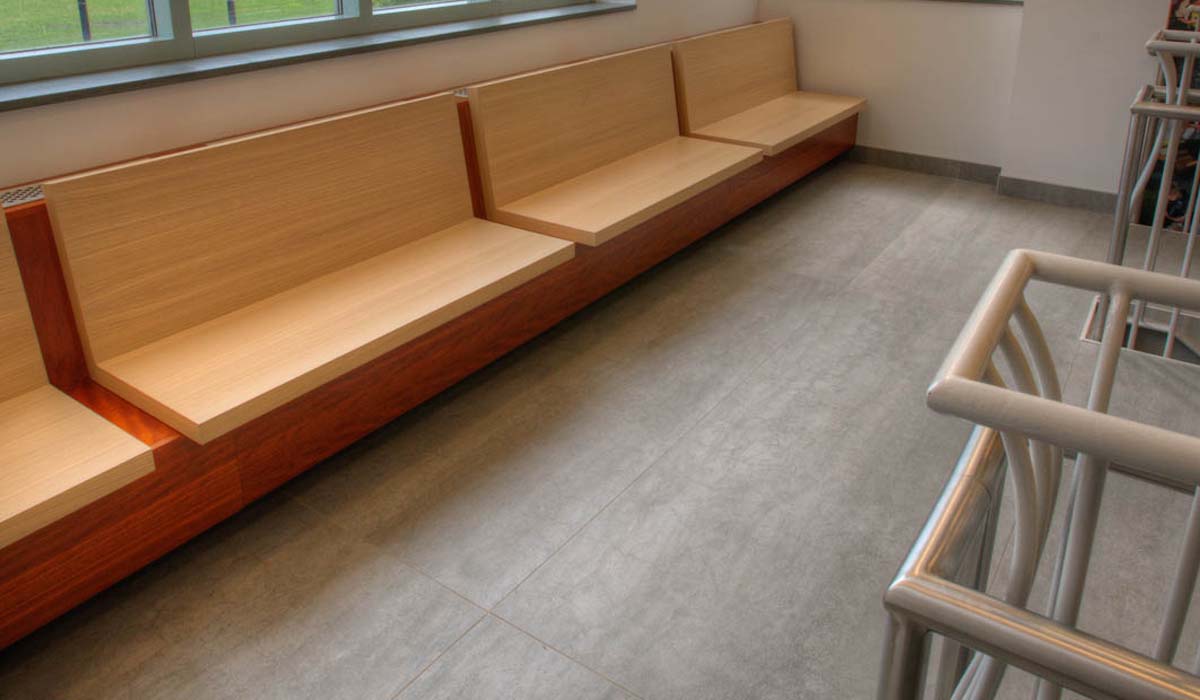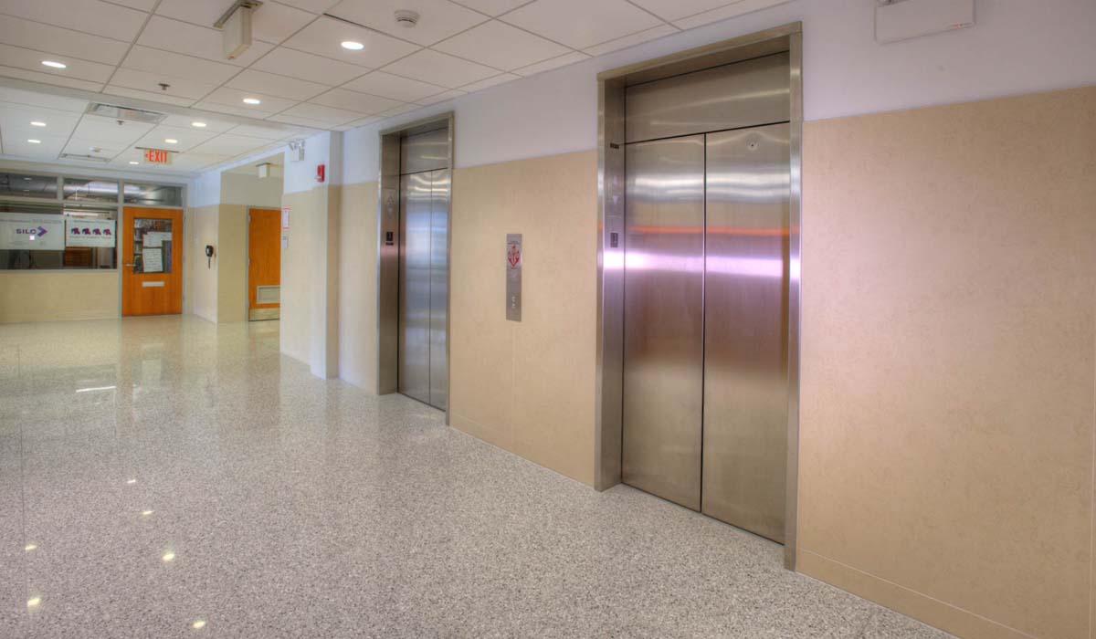Wall tile for the corridors was among the many features to be updated for the project. The existing walls had dated tile installed and needed a fresh look that aligned with the new, contemporary aesthetic. In considering an alternative covering for the walls, the design team looked for options that would help avoid a costly, time-consuming demolition to get rid of the existing wall tile. Additionally, from a sustainability angle, the team wanted to avoid sending old tiles and material to the landfill if possible. Working with Crossville, the team identified Crossville Porcelain Tile Panels by Laminam as an ideal solution for the project. These tile panels, with generously proportioned outer dimensions yet an extremely lean profile, can be installed with minimal grout line directly over previously installed tile, eliminating the need to demo the walls and ensuring no previously installed material would have to go to the landfill.