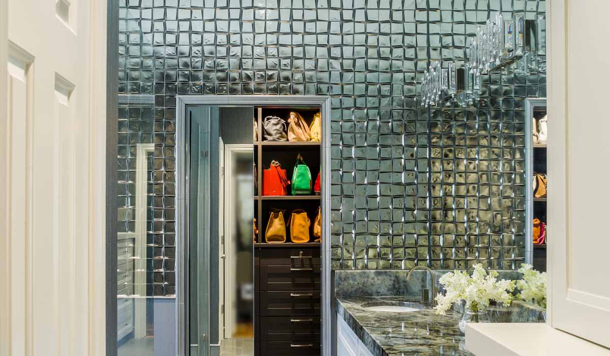 Crossville’s Sideview Glass mosaic wall tiles offer richly faceted metallics that reflect eye-catching style from every angle. These glass mosaics can serve as stunning showpieces or sparkling accents, bringing a brilliantly modern take on razzle-dazzle and a touch of art deco grandeur. In addition to providing glamour to the room, the mirrored sliding closet doors and reflective mosaic tiles create the illusion of a larger floor plan. The bathroom previously housed a tub that was removed and converted into a walk-in shower. This addition streamlined the space, allowing a larger shower area and easier access to the closet.
