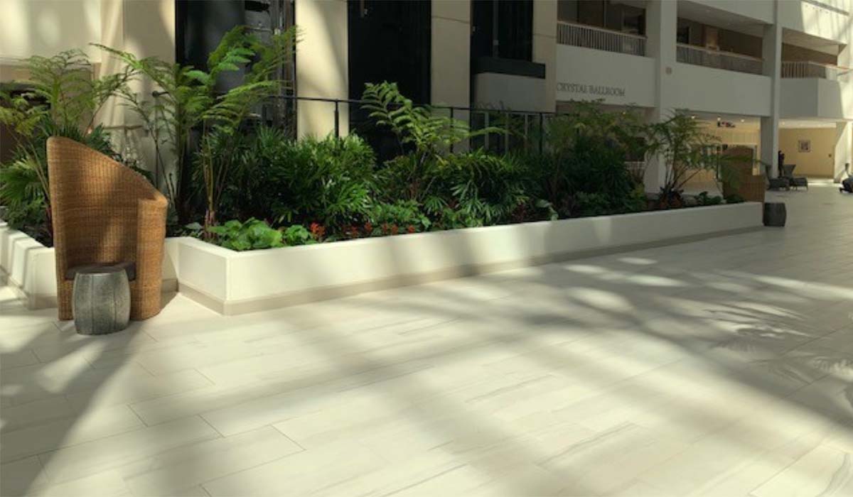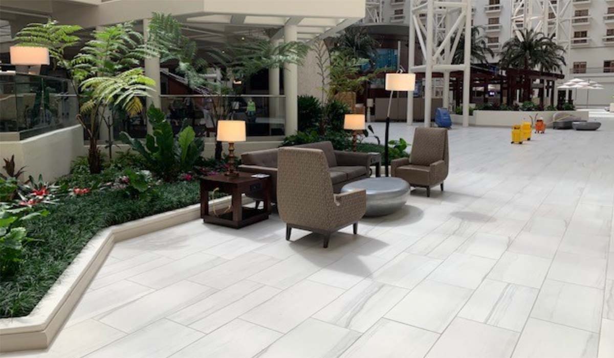 The replacing of lobby flooring in any open and operating hotel is no small feat. The process can be disruptive and off-putting for staff and guests alike. The challenges are compounded for a hotel the size and scope of Renaissance Orlando, as its atrium lobby encompasses a vast amount of surface area and serves as a major focal point for the entire facility. The team behind this project thoughtfully planned and considered all aspects of specification and installation to ensure as smooth a process as possible with exceptional results in terms of the chosen flooring’s style and performance.