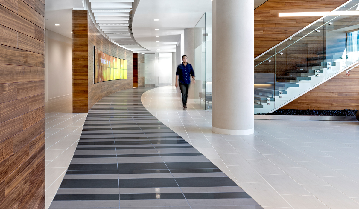To achieve this effect, Crossville’s Shades 2.0 porcelain tile was specified, in tones reminiscent of river rocks—a nod to the company’s name—to create visual representations of nature. This is evident in the Customer Center’s long, curving corridor, which is inspired by the undulating curves of a living river. The bright space, illuminated by day light, encourages movement, while also creating a restorative retreat for employees, who may be either opting for a few minutes of calm away from their desks or traveling from one task to another. In either case, the corridor temporarily pulls employees from the high tech world of screens and deadlines into a peaceful escape of earthy tones and solid, natural materials underfoot.