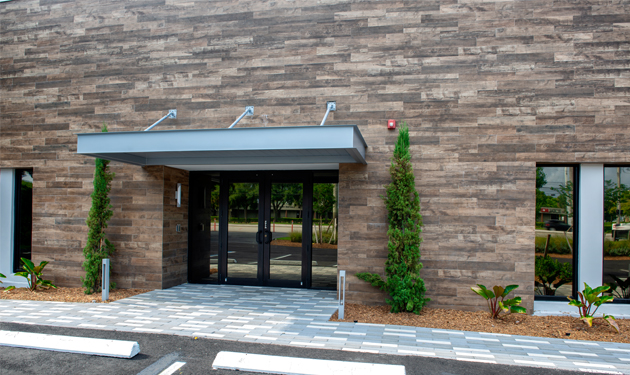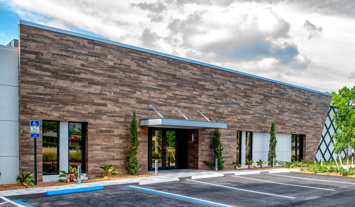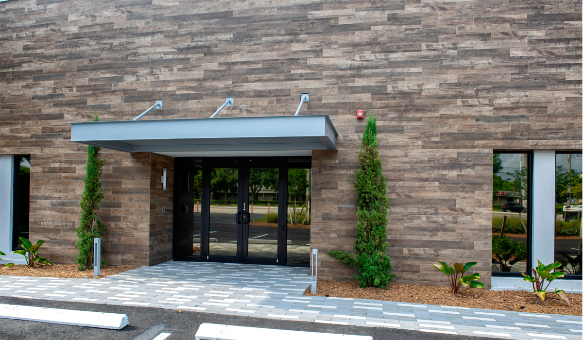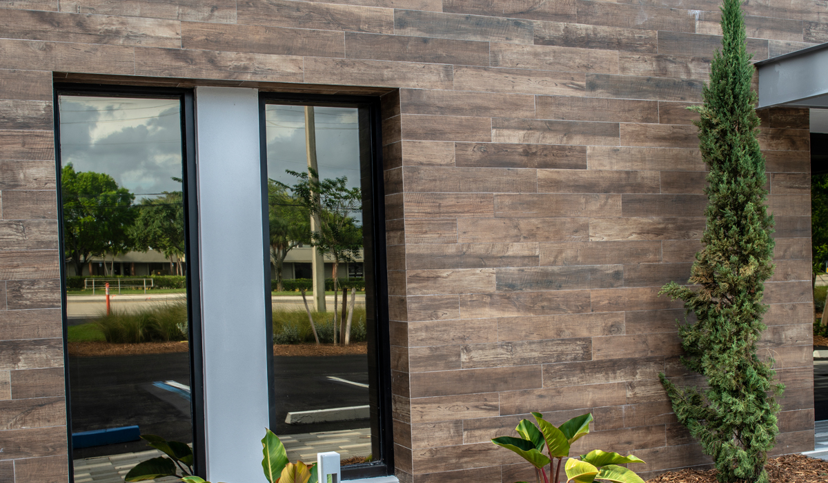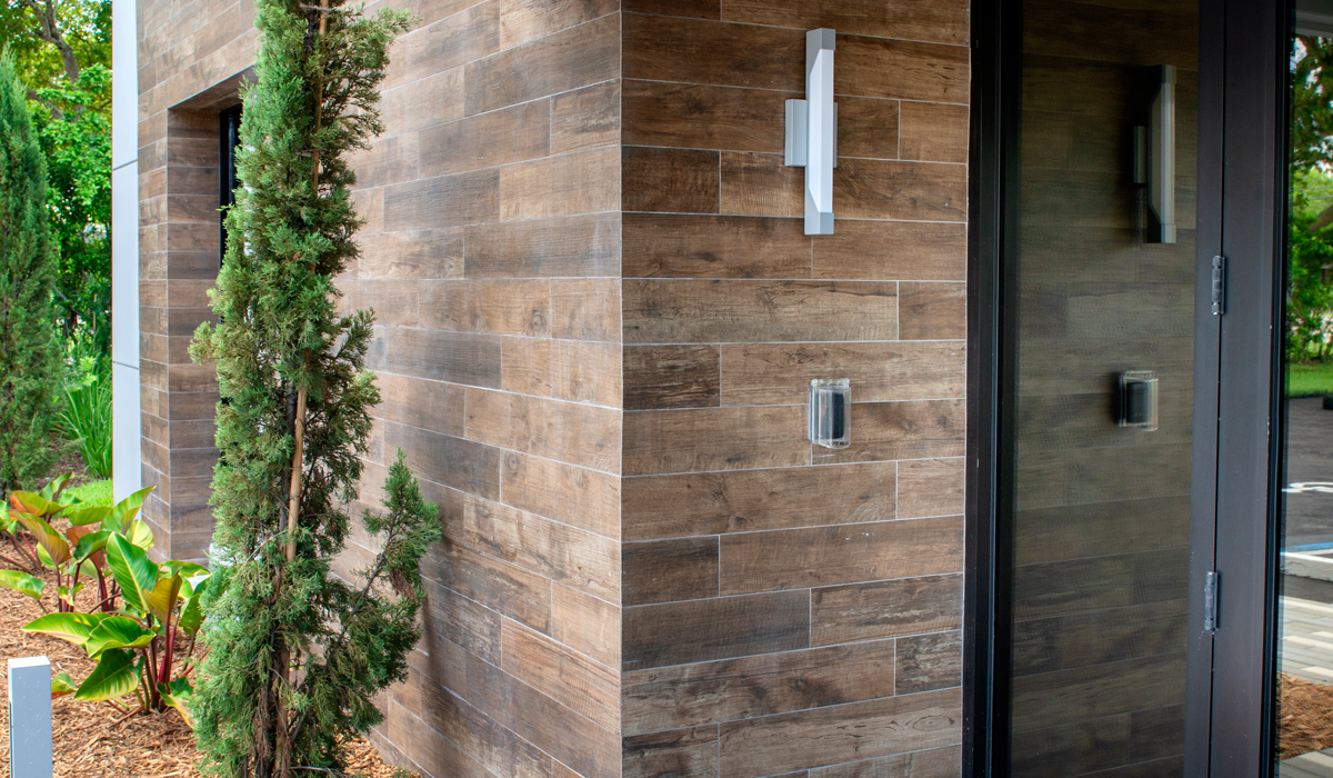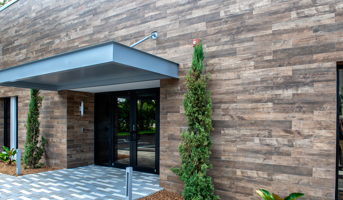 To bring unique, stand-out style to the exterior of the new office space, the team specified Crossville’s SpeakEasy tile collection in the Sweet Georgia Brown color. This nuanced, wood-look porcelain tile was chosen for its ability to add the warmth and softness of wood grain yet offer the lasting durability necessary for an exterior application—especially in the South Florida heat and humidity. This porcelain tile collection is virtually weather-proof and extremely simple to maintain, making it an excellent solution for challenging cladding projects.