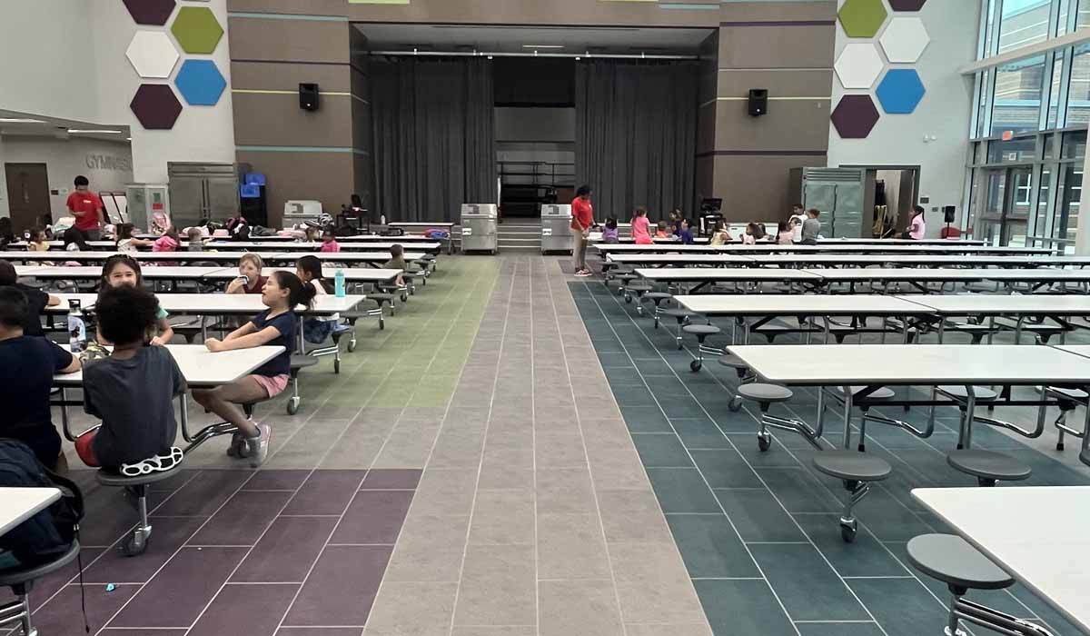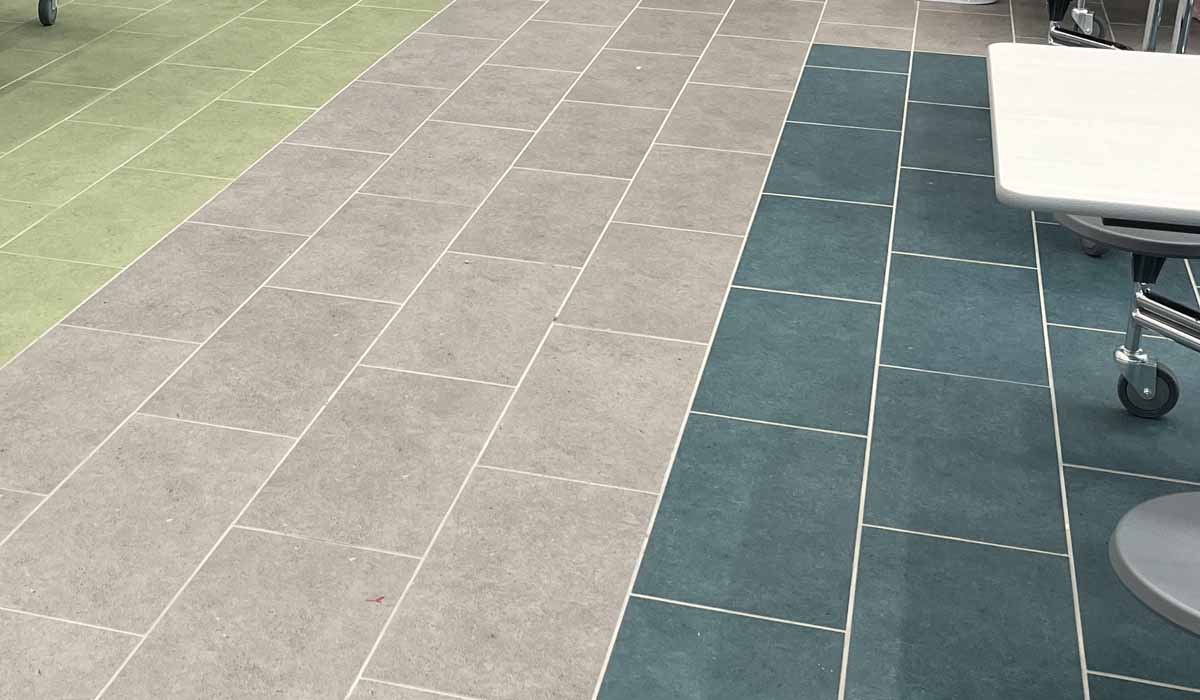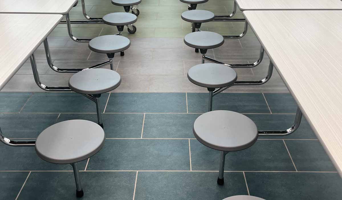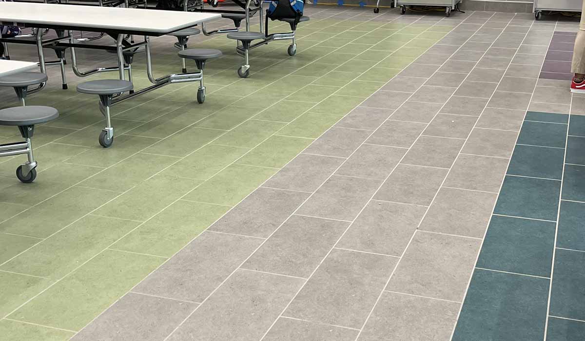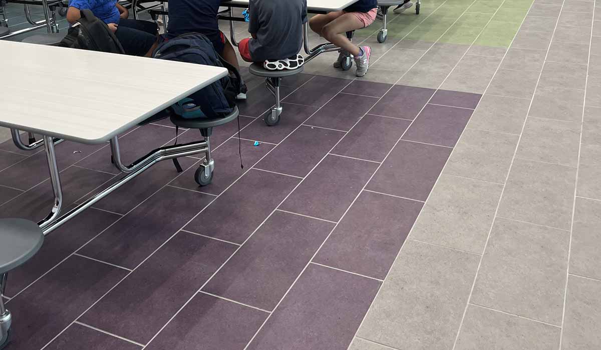 Noted for its beautiful bold appearance in a durable porcelain tile body that would meet all the performance requirements of the space, the team designed colored areas in the cafeteria providing subtle wayfinding. The main pathways were tiled in Argent’s Clean Slate hue, while the seating areas offering lots of color, were designed in Grapes of Wrath, Water Vapors and Hollywood and Vine hues. With the 12″ x 24″ option installed in an offset pattern*, the Argent tiles provide stunning color throughout the cafeteria’s generously proportioned seating areas.