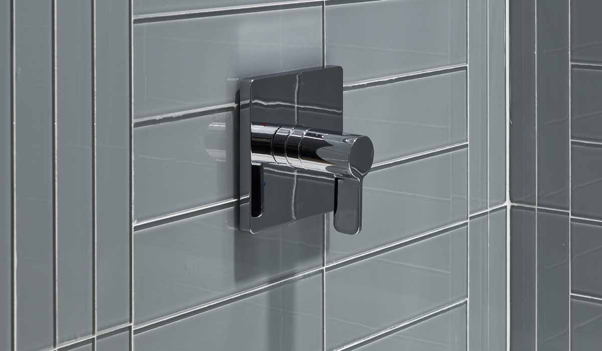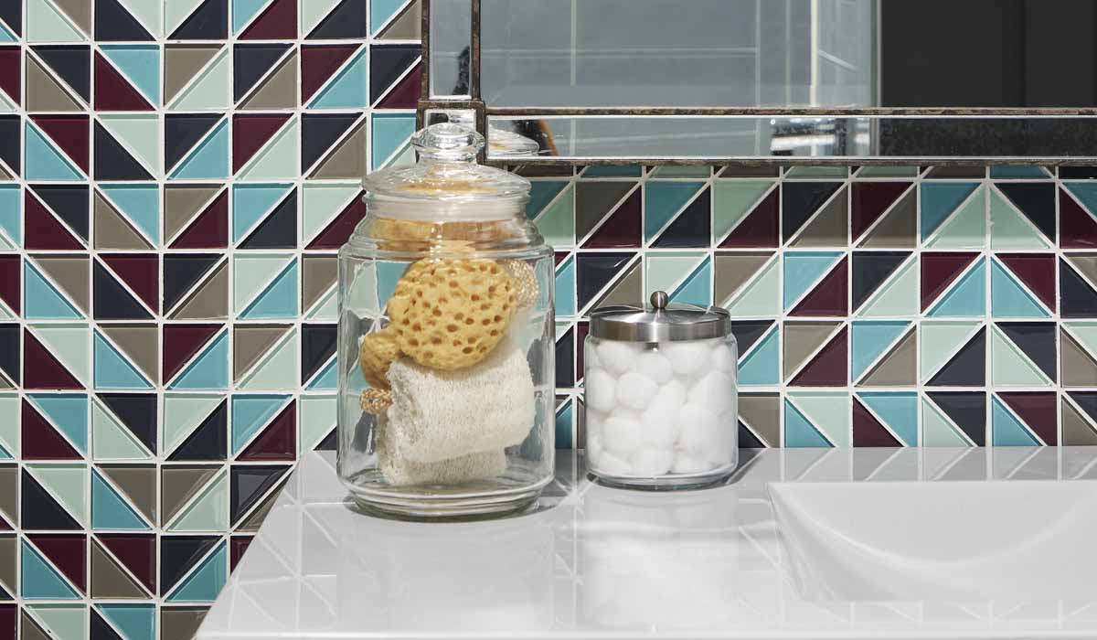 For the bathroom, the team installed an incredible mix of Crossville’s Groove Glass. Influenced by the artistic jazz of Miles Davis, the design team chose the stunning jewel tones in the Groove Glass Jive mosaic and balanced the style with the solid gray of Rumba in the 2” x 16” and the 4” x 12” sizes.