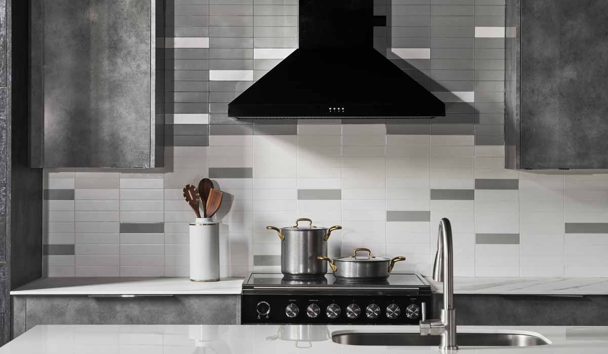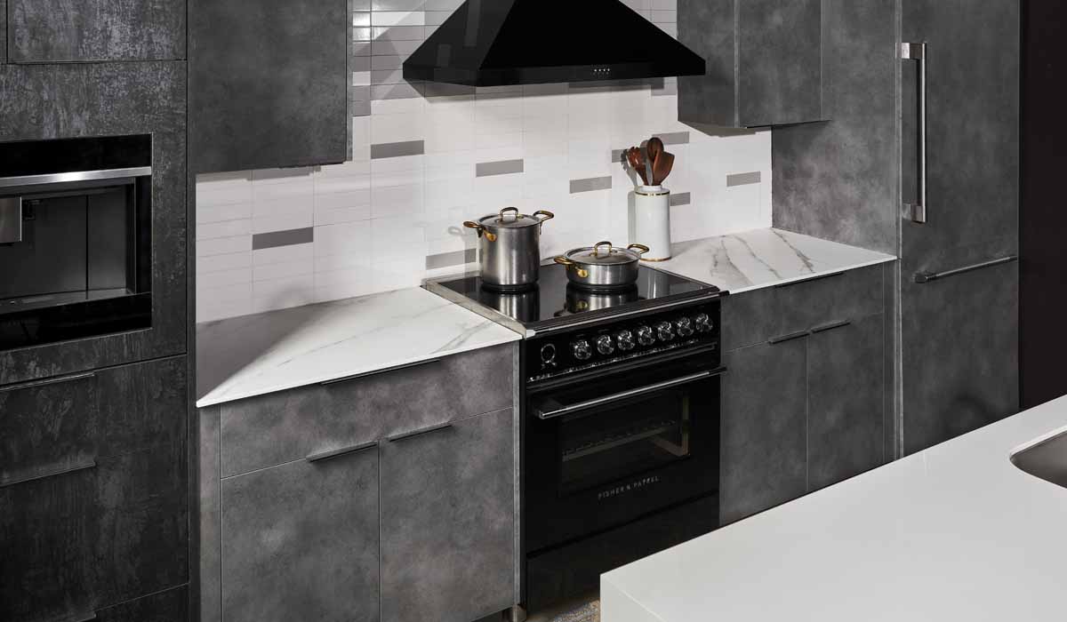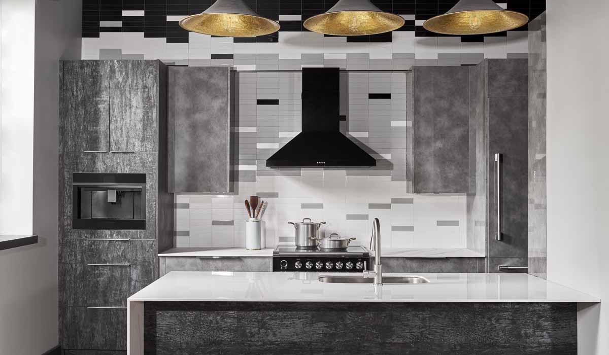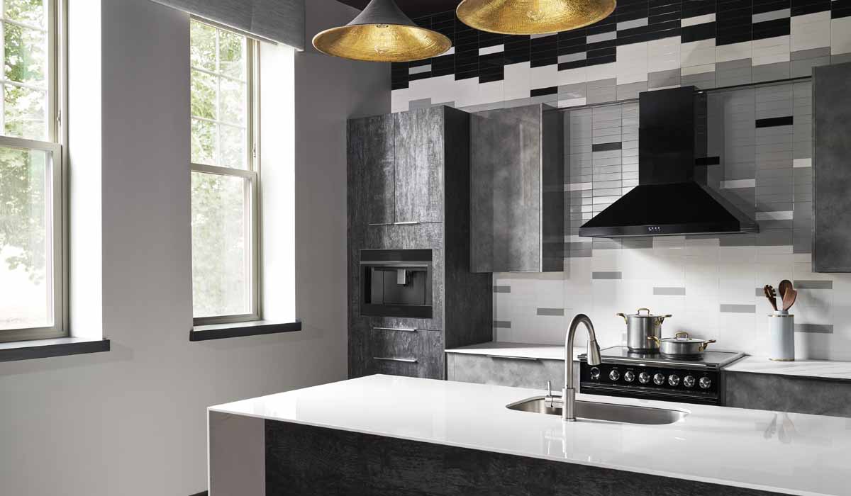 For the countertops, the designers chose Crossville Porcelain Slabs and Countertops again mixing two hues creating a unique aesthetic for this stylized kitchen. Choosing one slab in the stunning State of Grace offers the beautiful veining that mimics the look of natural marble. With gentle, stone-inspired nuances of grays mixed with subtle touches of black and brown tones, State of Grace is a durable porcelain alternative to true marble. The material offers easy maintenance and eliminates worries of staining and chipping that are common when using natural stone. Offsetting the marble effect, the team installed a porcelain slab countertop in the Sugar Coat colorway providing a stark white base against the beauty of the backsplash. With a waterfall to the floor and a mitered-edge option, the slab also provides extra protection for the cabinets against dings and nicks.
