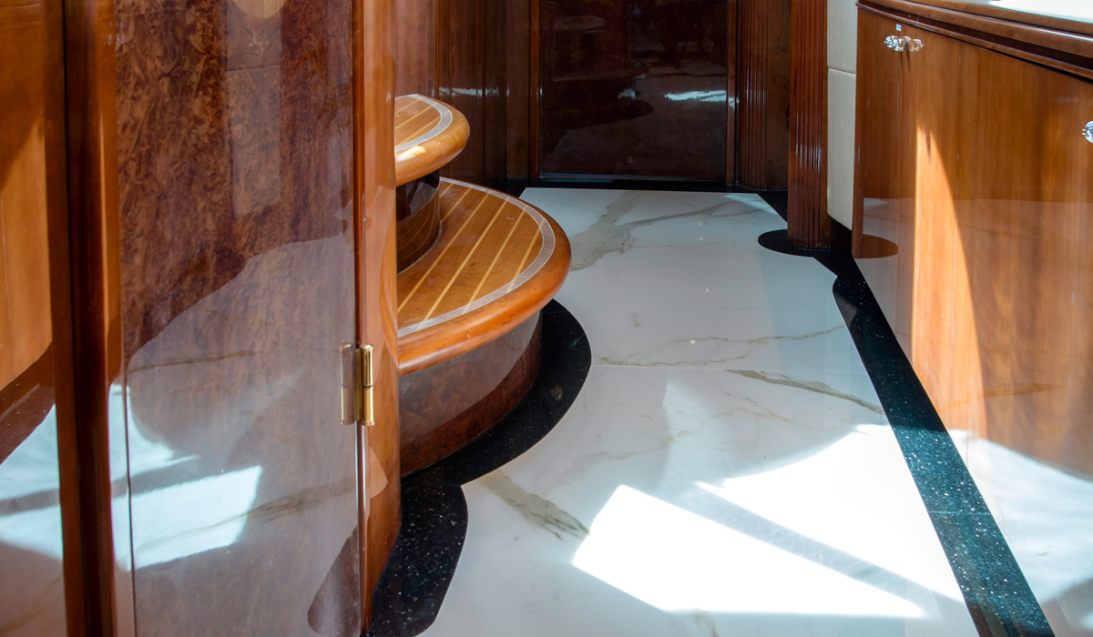 Laminam I Naturali in the Calacatta Oro Venato, featuring a rich, beautiful look akin to calacatta marble, was selected for Yacht Hillsboro. The 5.6mm thickness of the panels is durable for use on floors yet is still had a very lean profile that’s optimal for a seafaring vessel. The exceptional material enabled the installation team to fashion a book-matched application, creating a continuous flow in the design throughout the vessel.