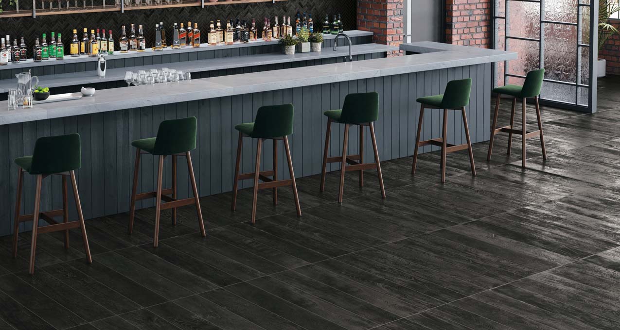 “We developed Jazz Age so that each detail on the tile planks tells a story. You’ll see what appears to be wear from nightly dancing on the wood graining, and we mimicked the high-low sheen club floors get from waxing. We even included the look of scuffs and subtle undulations that would come from chair legs and tapping feet.”