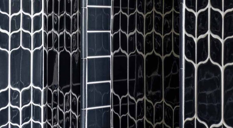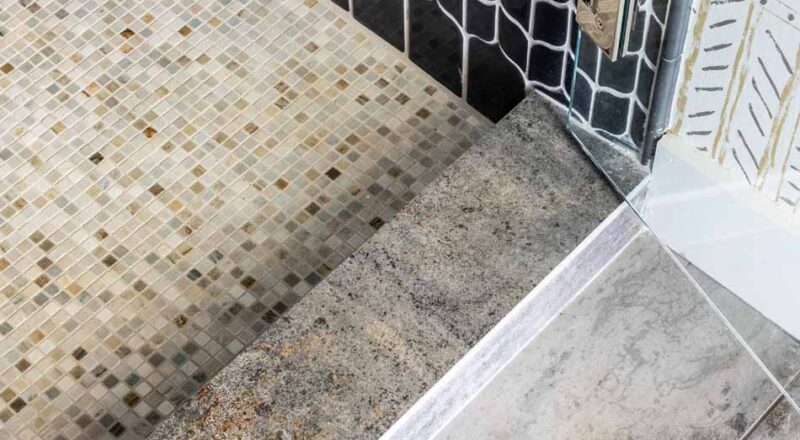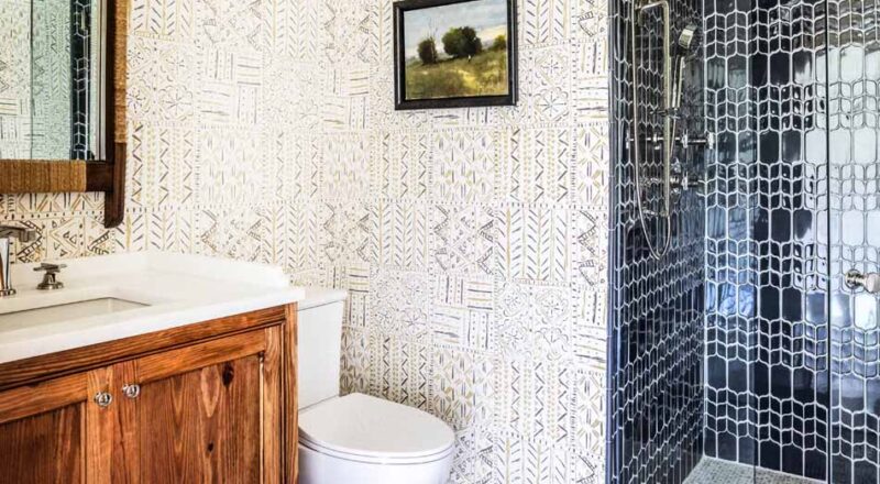 The lively wallpaper featuring painted strokes in lines, zig zags, and chevrons in beautiful goldenrod and gray coordinates with a bold blend of Crossville tile collections. Our Altered State in Steel Gaze for the floor picks up natural blues and browns with a metallic flare. The selections of our Handwritten mosaic tile, with its nuanced look of handmade artisanal tile, on the shower walls punctuate the entire design of the bath. Working closely with the tile installer, the design team created a custom pattern of 3” x 6” gothic picket and leaf mosaic tiles in the stunning Inkwell hue, pulling in a dark blue among the neutrals. On the shower floor, McKee chose Crossville’s Yin + Yang in Lotus Blossom finish the shower in a stunning blend of soft neutrals.