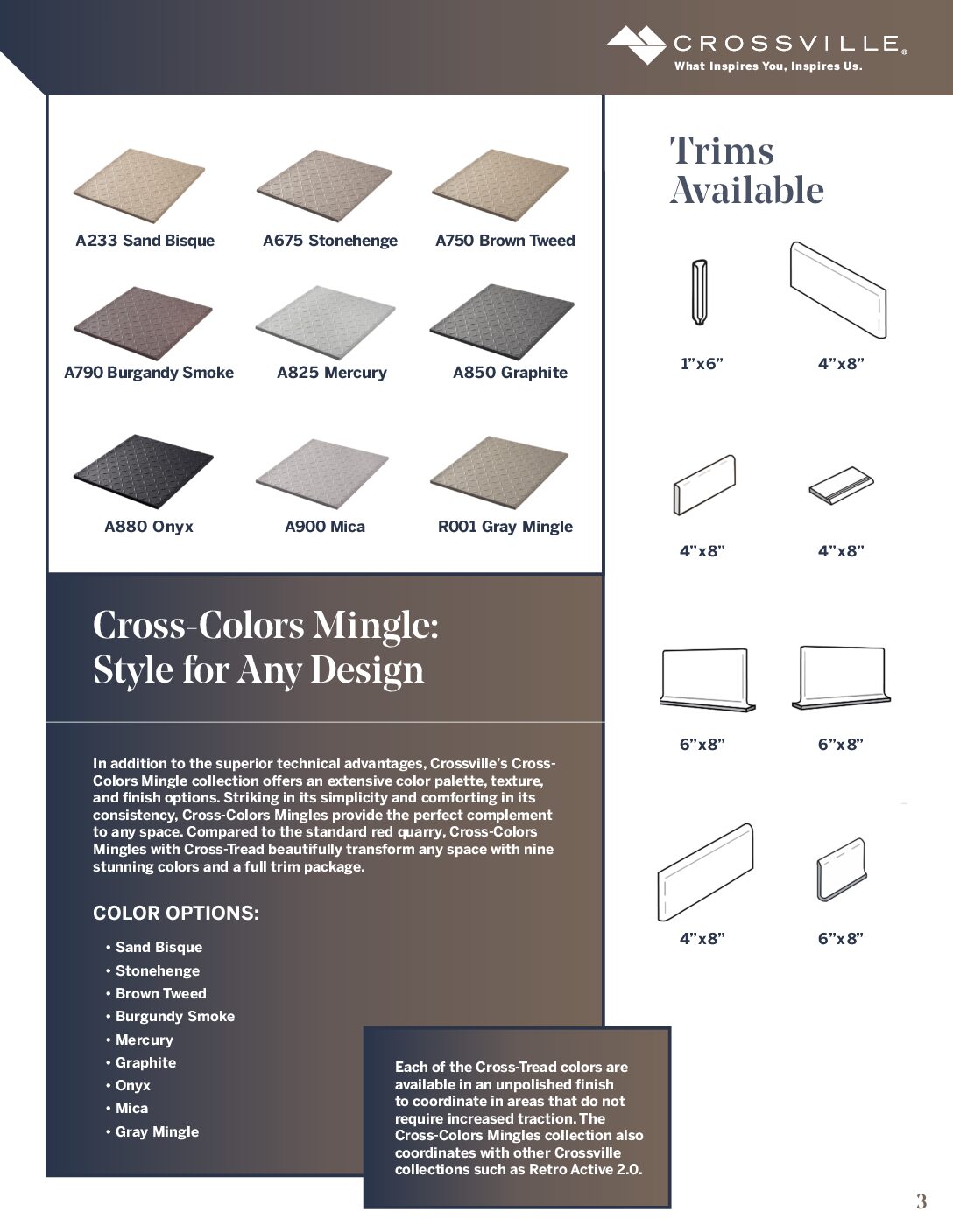 Both of these finishes are available in select sizes of Crossville’s Cross-Colors Collection. CROSS-SLATE® The Cross-Slate® finish combines the rustic and textured feel of slate with the through-body color and durability of Porcelain Stone®. Through-body color, unglazed structured surface, and a variety of sizes provide value where enhanced traction is needed for hightraffic interior and exterior spaces. Cross-Slate is recommended for interior floors and walls, as well as exterior walls and exterior walking surfaces in both residential and commercial environments.